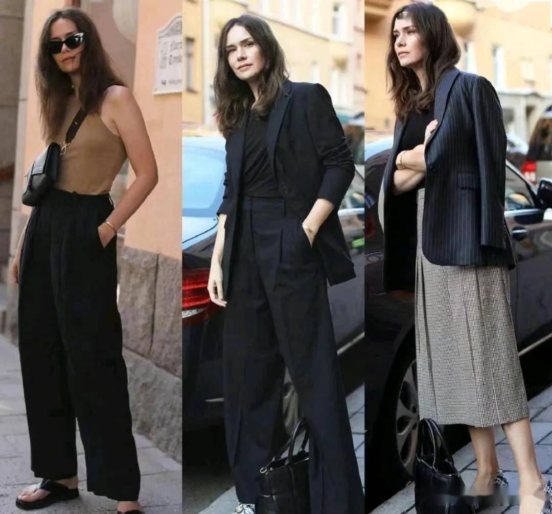 上班可以选择一件黑色的廓形西装,忽略掉曲线显得格外大气洒脱,搭配黑色的针织衫与黑色阔腿裤,整套搭配轻松穿出高级感,又能打造出职场大女人的飒美,原来女人帅起来就没男人什么事了。