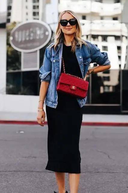 经典蓝色其实挺日常的,不挑剔身材和气质,若是像这样点缀一个红色包包,有画龙点睛的效果!