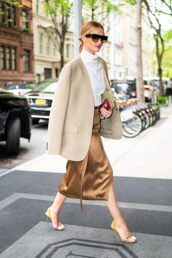 西装严肃中性,和浪漫优雅的裙子结合,穿出刚柔平衡的效果,女性的温柔和力量感双双拿捏住了。
