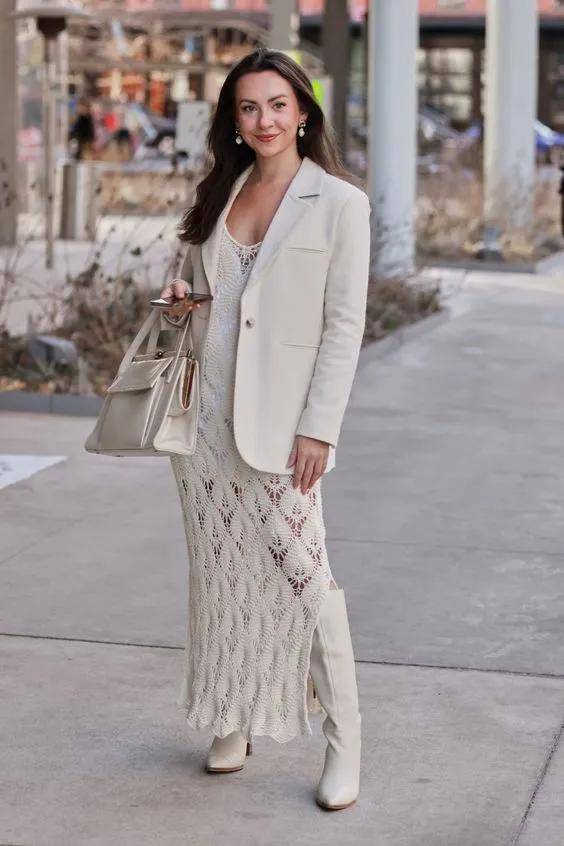 西装一般是比较基础简单的设计,所以为了表达更多的时髦感,内搭选择设计款连衣裙,简繁的结合依旧可以穿出平衡的感觉,时髦且气质。