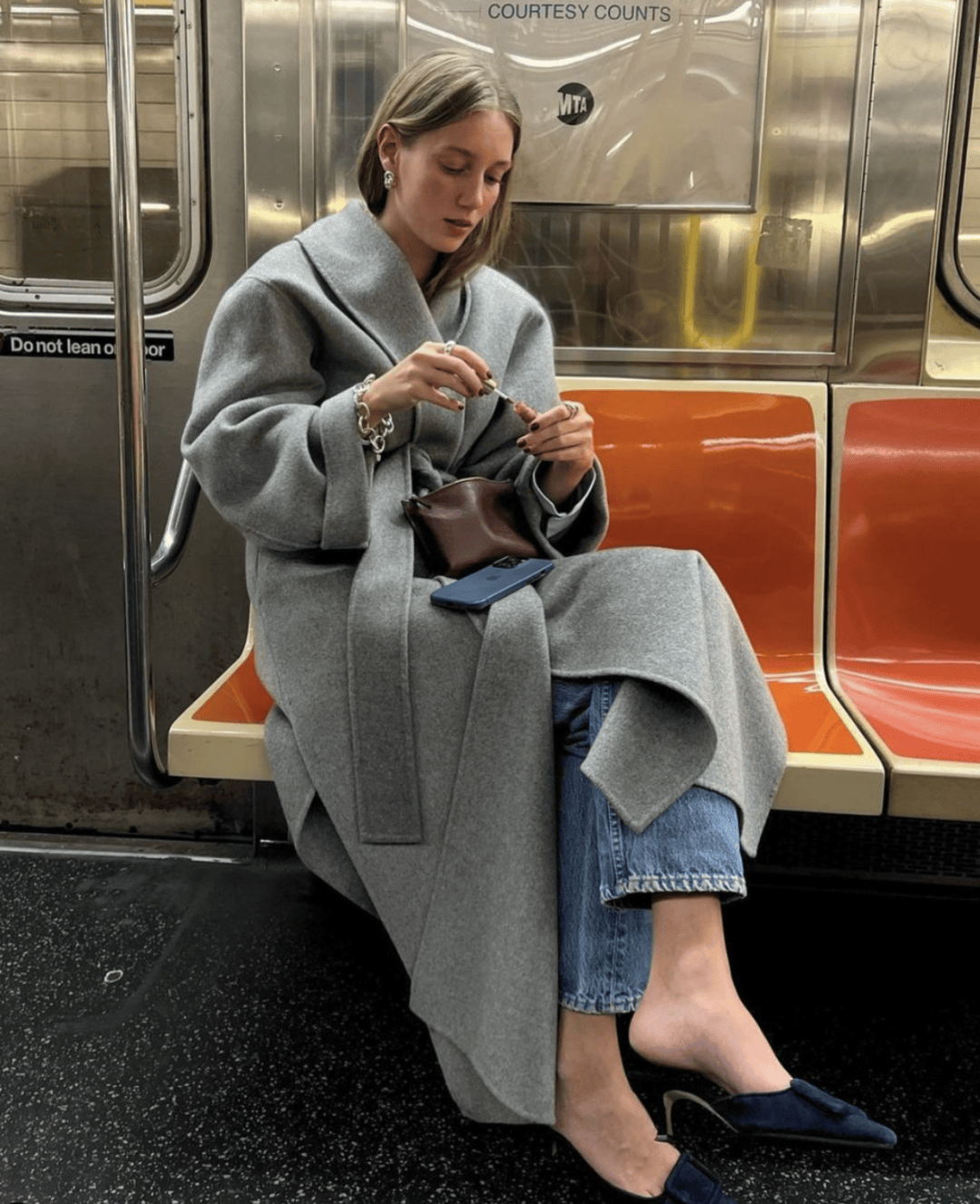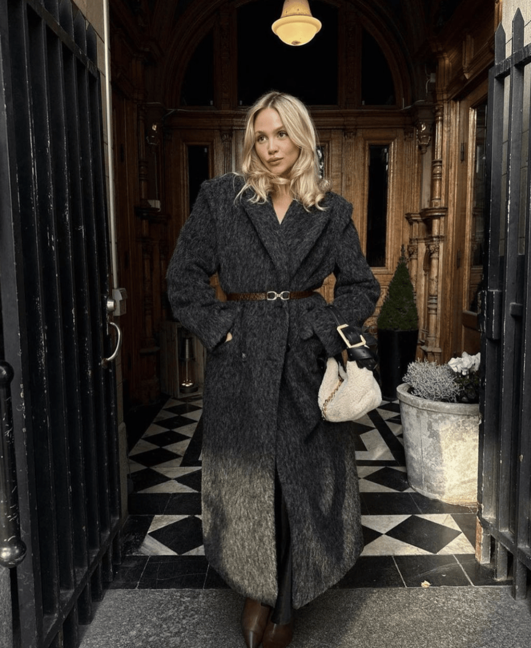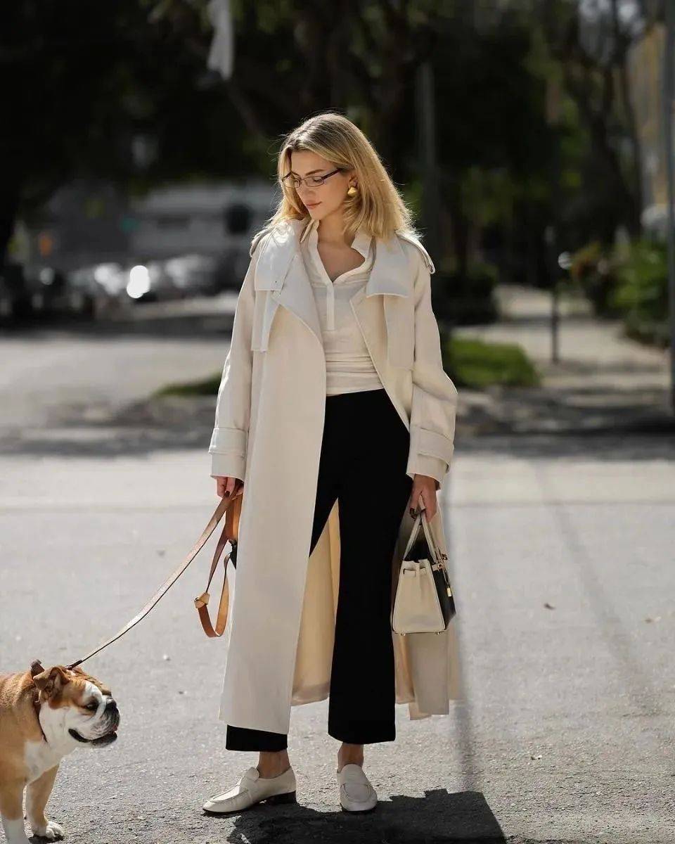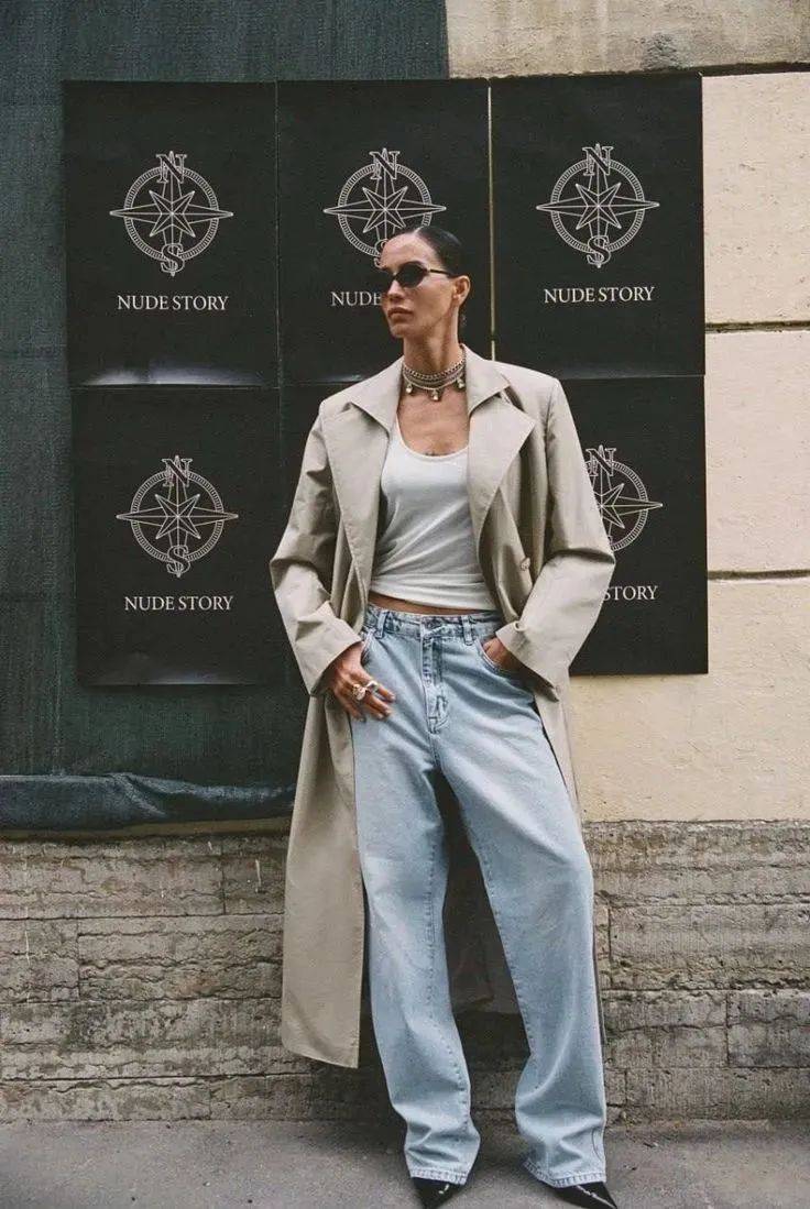 一个浅色的长款外套,简约而略显沉闷,然而,当一条闪耀的金属项链被轻松地搭在脖子上,整个造型瞬间被点亮。