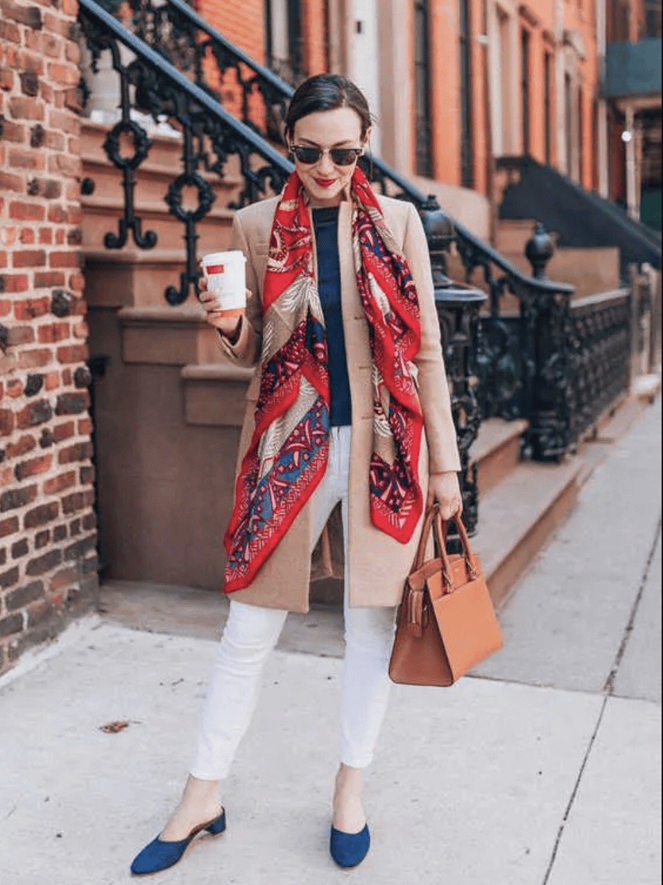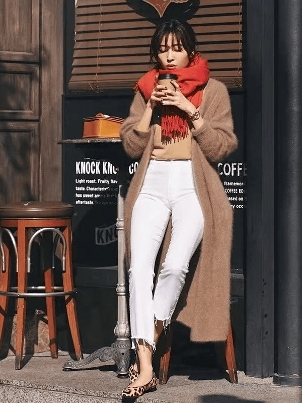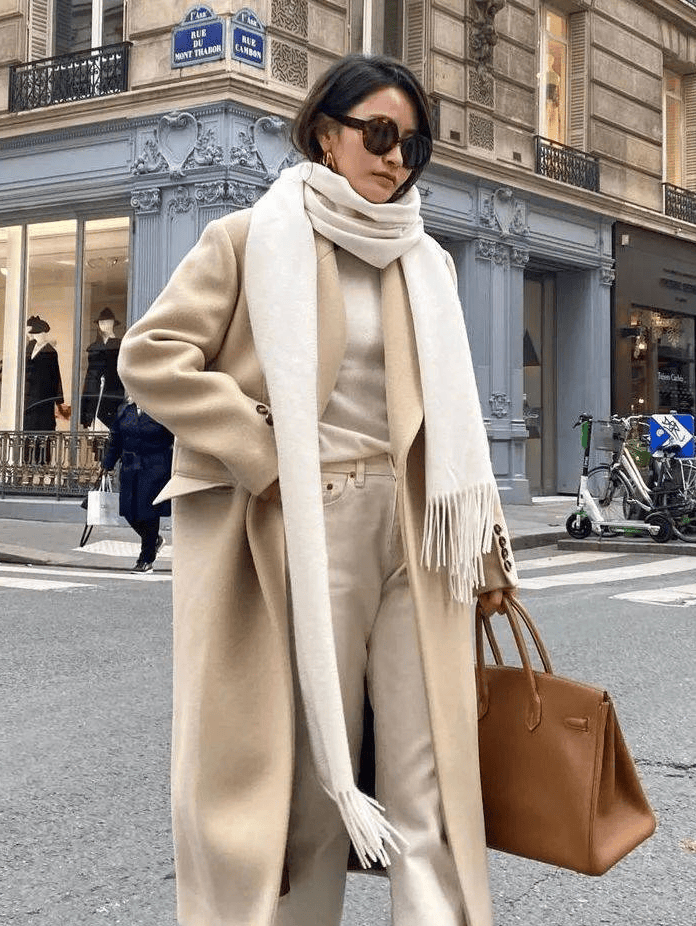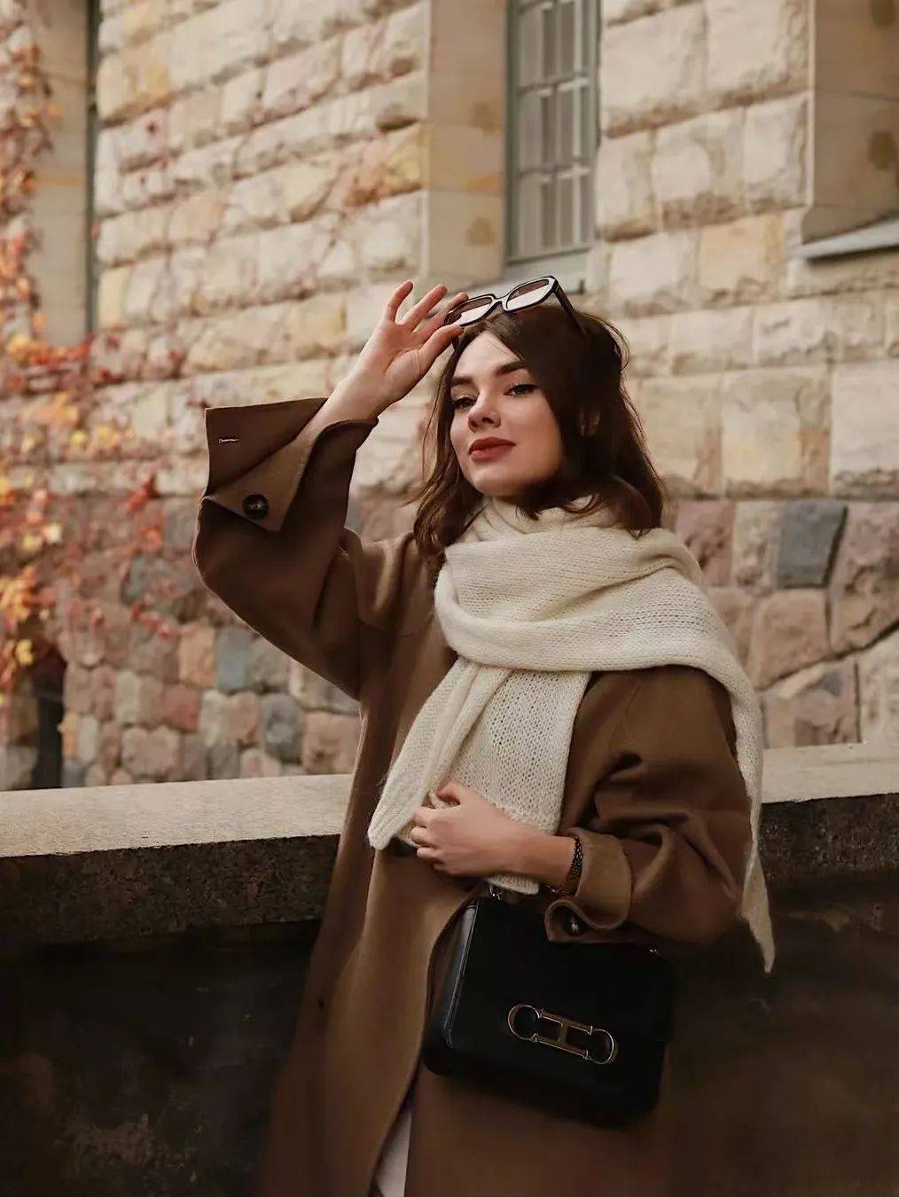 日常通勤:浅驼色大衣内搭米色毛衣与直筒牛仔裤,叠搭撞色围巾,极简但不失高级感,围巾系法不需刻意复杂,让你轻松应对工作场合。
