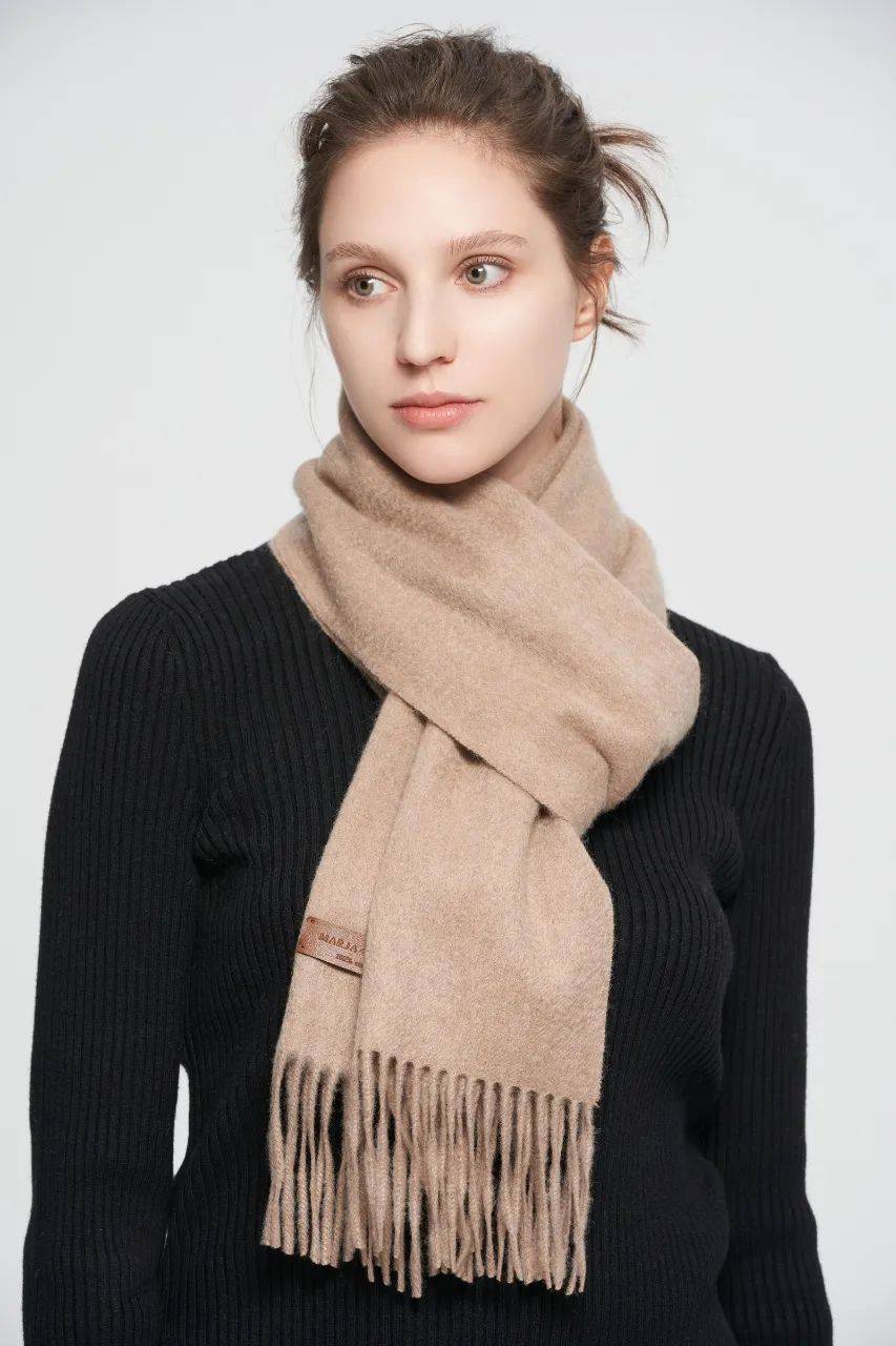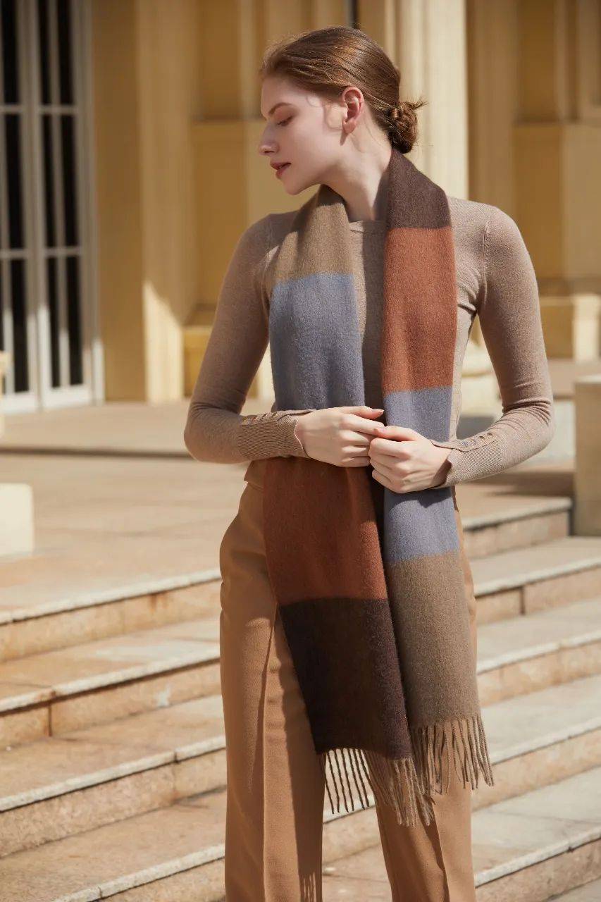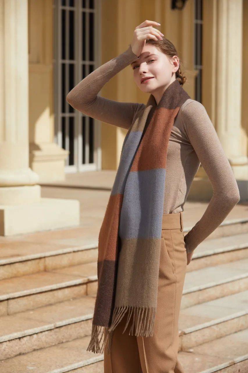 这种质感增强了米驼色的亲和力,让佩戴者在视觉和触觉上都能感受到舒适与温暖。同时,围巾末端的流苏设计又增加了一丝随性与灵动。