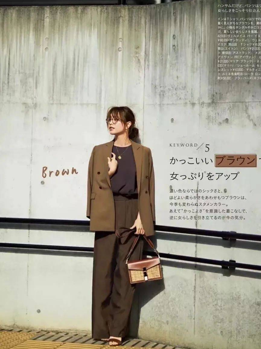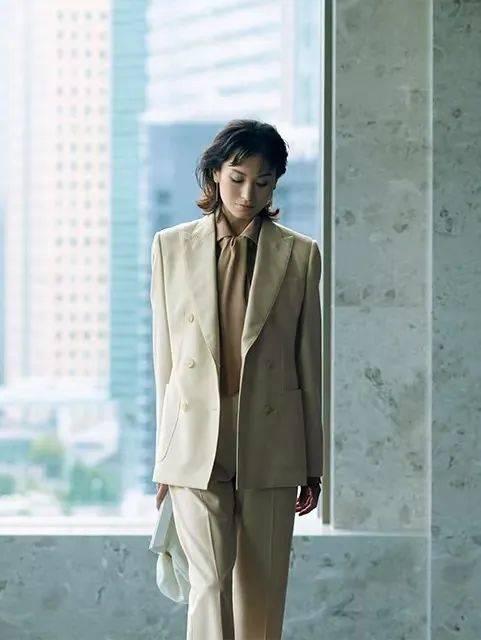 通勤时,用深驼色西装搭配同色系铅笔裙,内衬一件象牙白丝质衬衫,脚踩黑色短靴,既体现了职业感又不失优雅腔调。