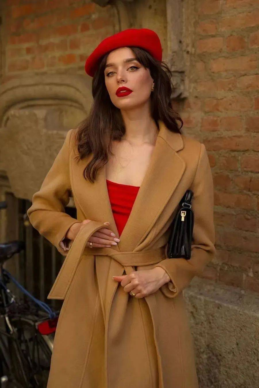 浅驼色+酒红色or粉色,酒红色在秋冬季非常受欢迎,具有节日的气息和吸睛的色彩感,与浅驼色搭配可以营造出活力十足的造型,适合圣诞等节日场合。