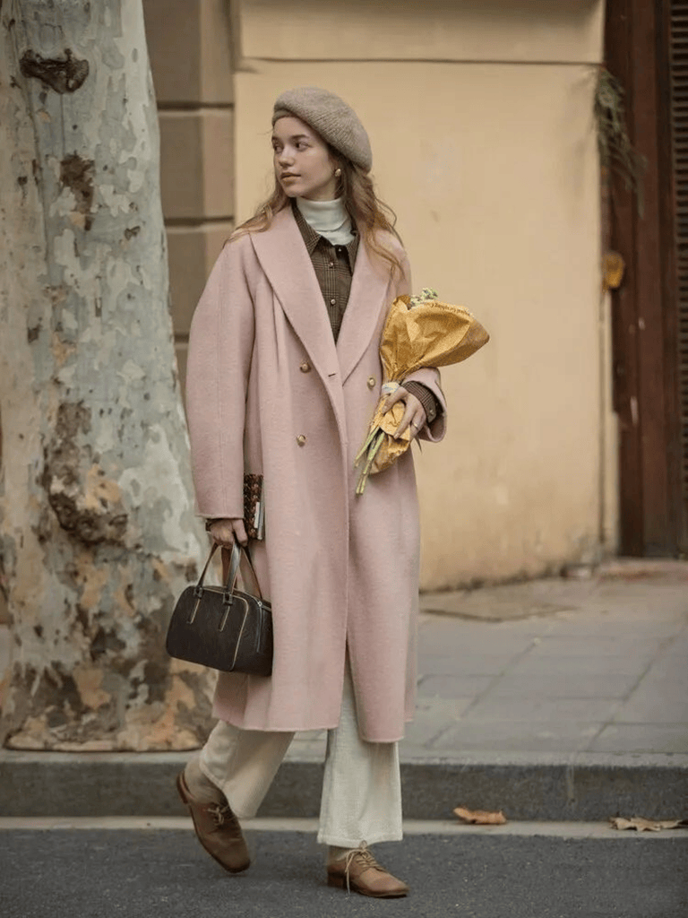 咖啡馆场景:一件驼色长款毛衣,搭配羊绒围巾与贝雷帽,增添慵懒的时尚感,同时提供足够的保暖度,完美适应街头与咖啡馆等随意的场景。