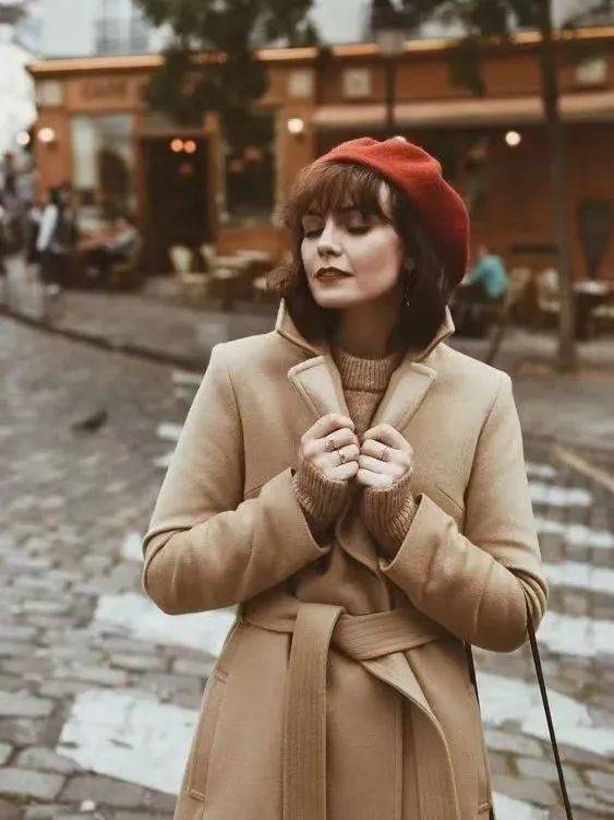 中驼色本身质地柔和,因此可以通过配饰为整体增添亮点。如一条印花丝巾,一件别致的贝雷帽,如果担心整体过于素净,建议加入金属配饰,比如简单的金色耳环或手链,进而增加一丝精致感。