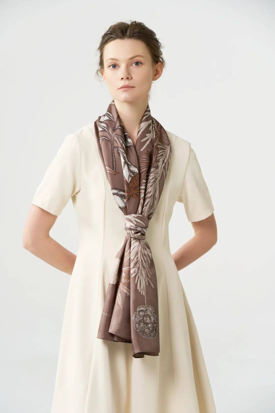 设计师通过细腻的白色与棕色来描绘松针、松果等细节,与浅驼色形成柔和对比。白色松枝如同初冬的霜雪,在浅驼色背景上显得格外清爽、明亮, 为佩戴者带来通透感。