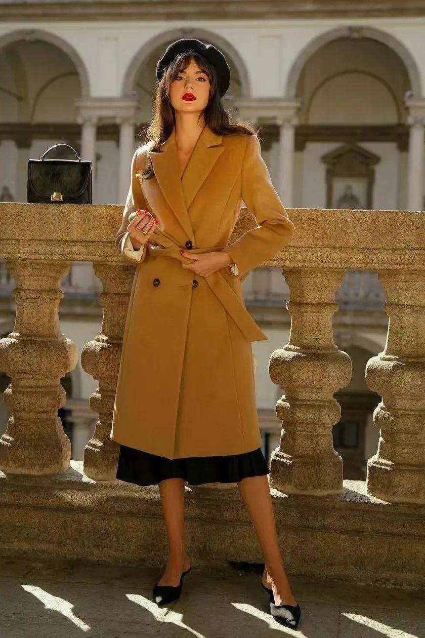 商务会议:而在较为正式的场合,中驼色同样不失魅力。一件裁剪利落的驼色风衣搭配西装裤,点缀一条质感围巾or包袋,既保留了沉稳的气质,又展现出干练利落的职场风范彰显出穿戴者的从容与自信。