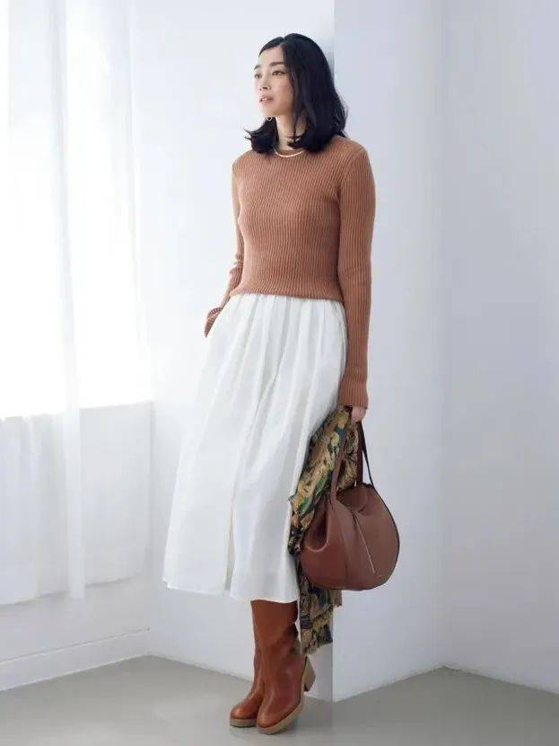 周末出行:浅驼色高领毛衣搭配白色九分裤与米色运动鞋,营造一种舒适与活力并存的风格。可以选择一条印花丝巾作为颈间的点缀,或将丝巾系在包带上,增添灵动感与细节美感。