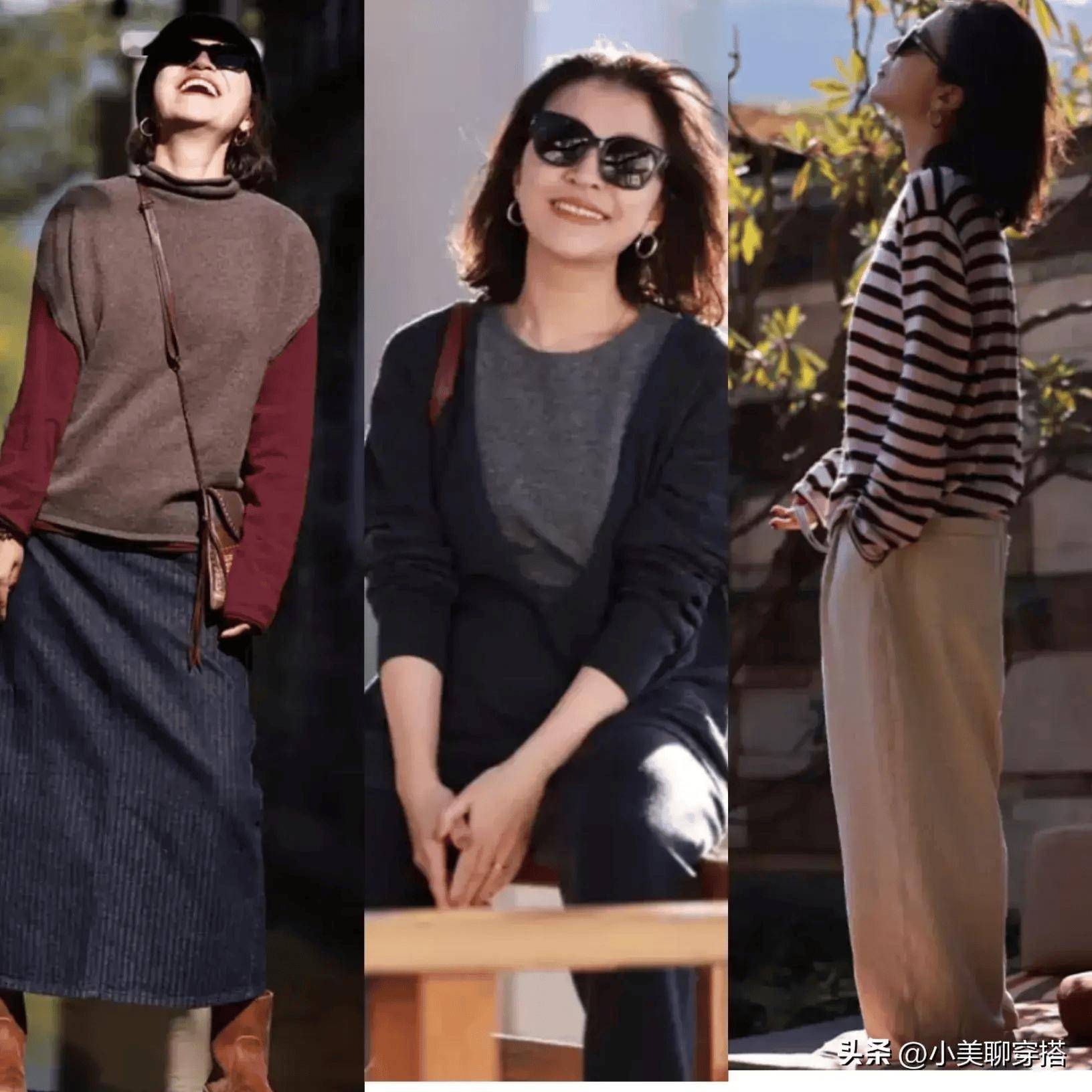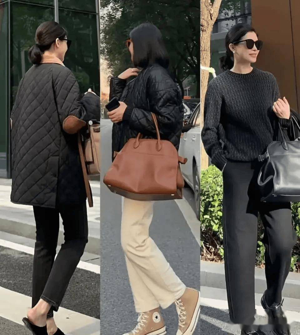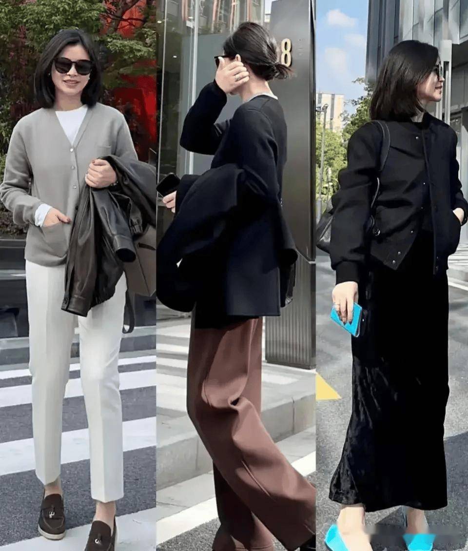 基础色的搭配更适合 40+女生,我们不必为了追求减龄而让自己穿得过于明艳或是过于粉嫩,其实经典的基础色才是最适合我们的,既有高级感,同时也可以穿出自己的风格。 经典的黑白灰是永远也不会过时的基础色,而且更适合成熟一些的女生,简洁的配色轻松打造出松弛感来。黑色的毛衣,简单又显高级,搭配咖色的阔腿裤,配色减龄又不装嫩,而且很时髦。灰色的毛衣开衫,选择了白色T恤与白色烟管裤,配色清爽干净,显得人更年轻了。