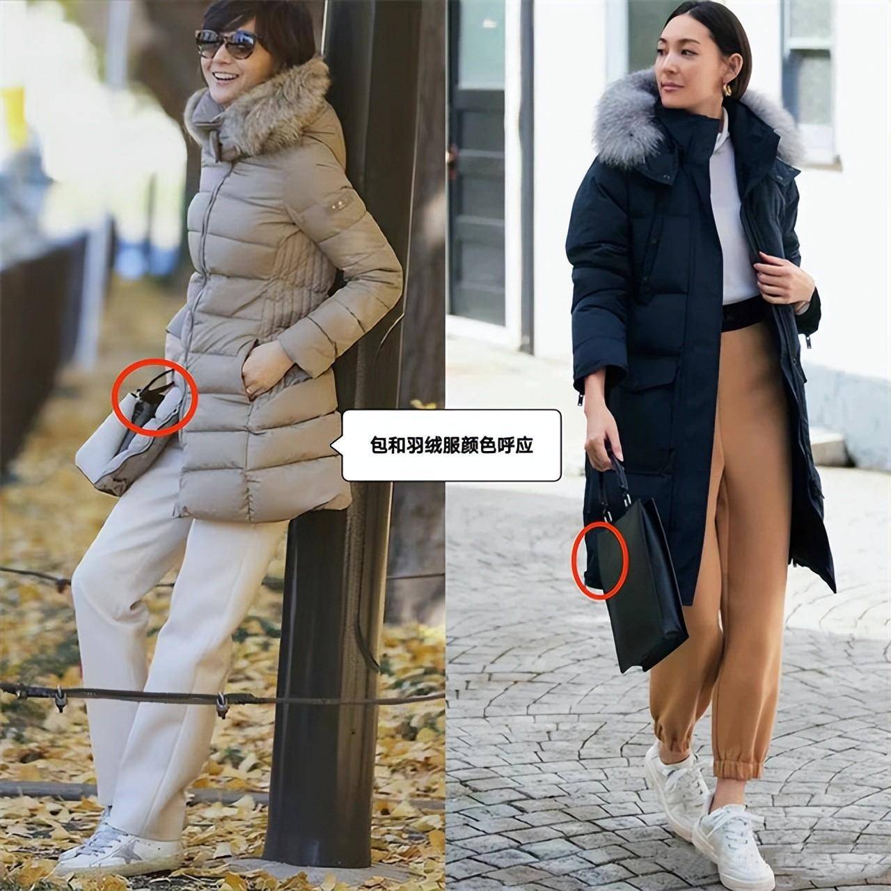 说到包包,特别推荐选择小方包或手提包,因为这类包包的立体感能很好地平衡羽绒服的蓬松感,而且方正的线条还能为整体造型增添一份干练感。手提包更是能让整个人显得精神抖擞,特别适合我们这个年龄段的女性。