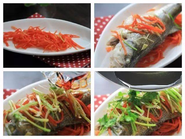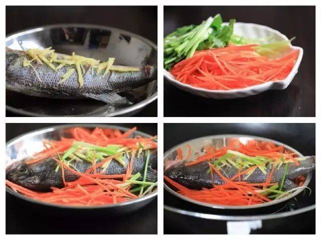 1、将鱼处理好洗干净,在表面抹上盐和白胡椒粉,鱼肚里放入姜丝,腌制15分钟,去腥调味。 2、胡萝卜切丝,一部分放在盘底,放上腌制好的鱼。