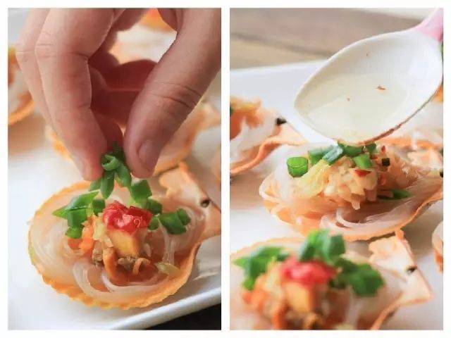 1、将粉丝泡发。 2、从壳上取出扇贝肉,用淀粉抓洗几分钟,然后用清水洗净。将肉放入碗中,用料酒腌制10分钟。 3、用刷子洗干净壳,一次放入粉丝、扇贝肉。