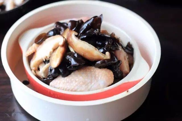 4、将木耳、香菇放入鸡块中,放入锅中高火蒸30分钟