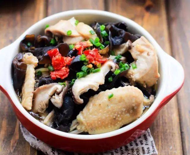 木耳蒸鸡,口味鲜香,色泽鲜亮,鸡肉滑嫩适口,黑木耳吸收了鸡肉的汤汁,非常鲜美。