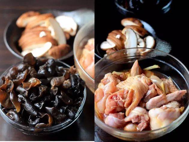1、鸡肉切块,水中浸泡洗净 2、将鸡块放入碗中,加入蚝油、老抽、盐、姜丝,腌制30分钟 3、把木耳泡开,香菇切片