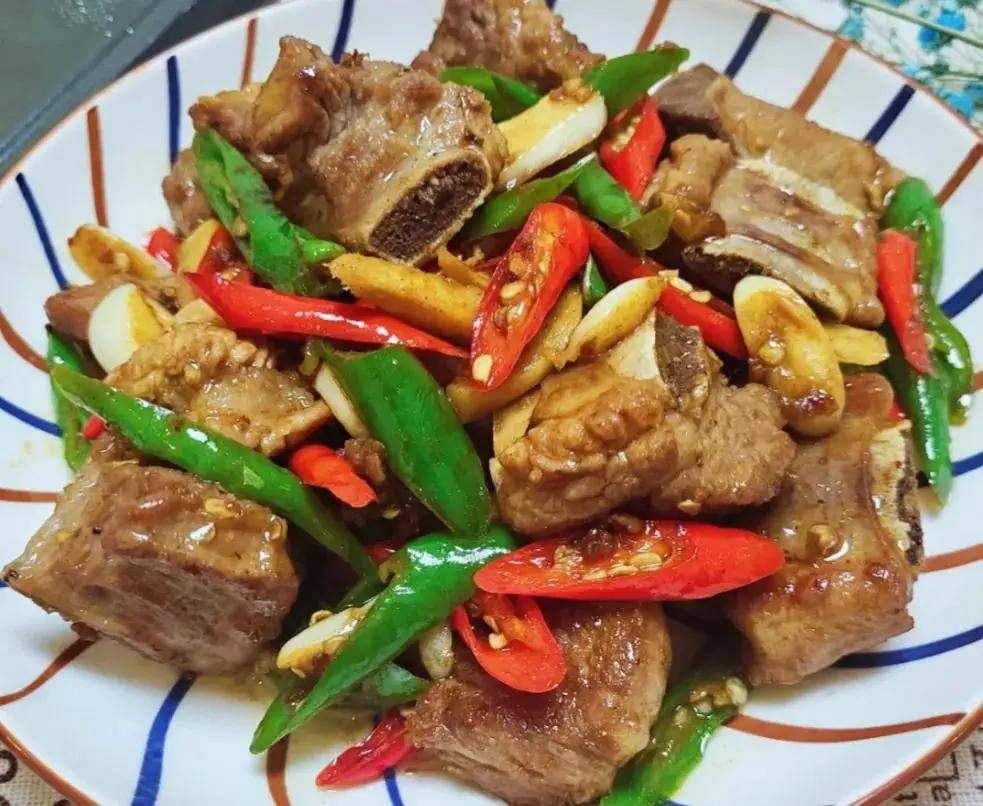 1、准备食材:蒜苔、排骨、料酒、白砂糖、生抽、生姜、老抽、蚝油、陈醋、食盐 2、蒜苔炒排骨的做法: (1)蒜苔洗净切段,排骨洗净切段,青红辣椒切段,生姜去皮切片备用。 (2)排骨冷水下入锅中,加入适量的料酒焯水片刻捞出,冲洗一下沥干水分备用。 (3)起锅烧油,倒入适量的白砂糖,翻炒至融化,下入排骨翻炒上糖色。 (4)加入适量的生抽、老抽、蚝油、倒入适量的清水漫过食材。 (5)盖上锅盖大火炖开,开锅下入青红辣椒翻炒片刻,再撒上少许食盐调味。 (6)关火出锅装盘即可开吃了,酱汁浓郁,排骨这样做好吃到停不下来,大人小孩都喜欢吃!
