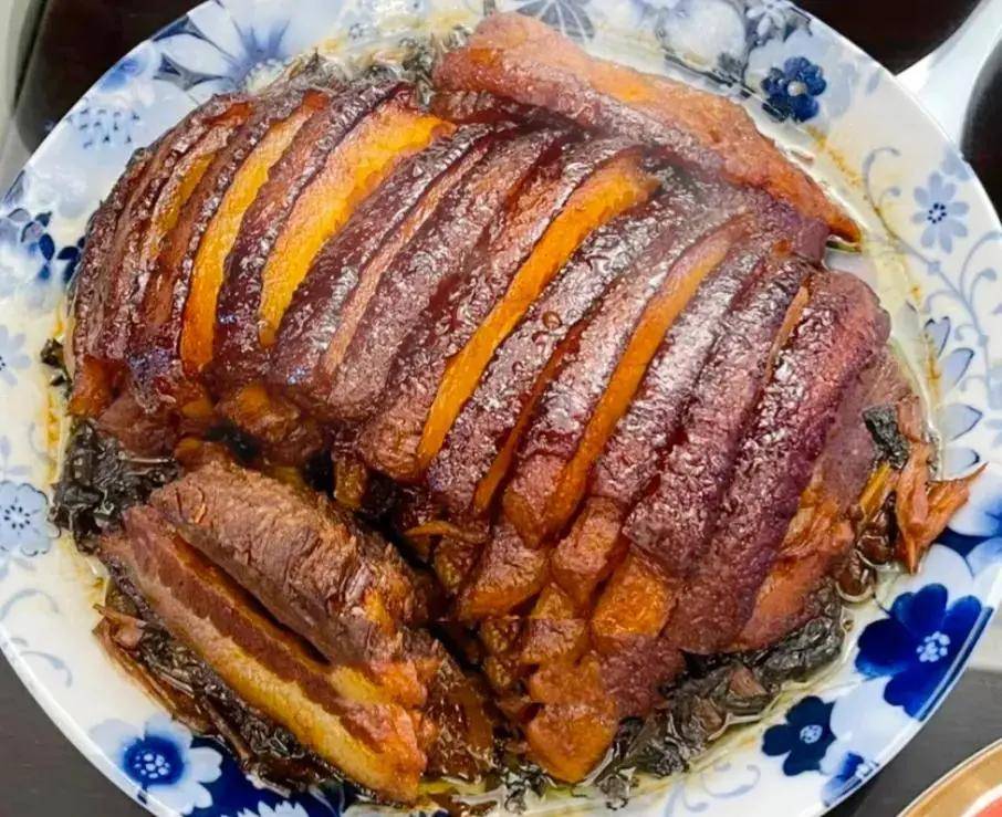1、准备食材:五花肉、梅菜、小葱、生姜、蒜瓣、豆腐乳、料酒、生抽、蚝油、老抽、食盐、白砂糖 2、梅菜扣肉的做法: (1)五花肉洗净,梅干菜洗净切碎,小葱切葱花,生姜去皮切片,蒜瓣剥皮切末备用。 (2)调料汁:碗中倒入适量的豆腐乳、生姜、料酒、生抽、蚝油、老抽、食盐、白砂糖搅拌均匀备用。 (3)锅中热油爆香生姜蒜末,下入梅干菜翻炒均匀,摆入盘底备用。 (4)五花肉冷水下入锅中,加入适量的小葱、生姜、料酒焯熟捞出,沥干水分备用。 (5)将五花肉表面用牙签扎几个小孔,放入油锅中炸至金黄色捞出。 (6)放入冷水中浸泡一会切片,倒入调好的料汁抓拌均匀,皮朝下摆入梅干菜上。 (7)上锅蒸一个小时左右,关火出锅撒上少许葱花即可,肉鲜嫩软糯,肥而不腻,入口即化,大人小孩都喜欢吃!