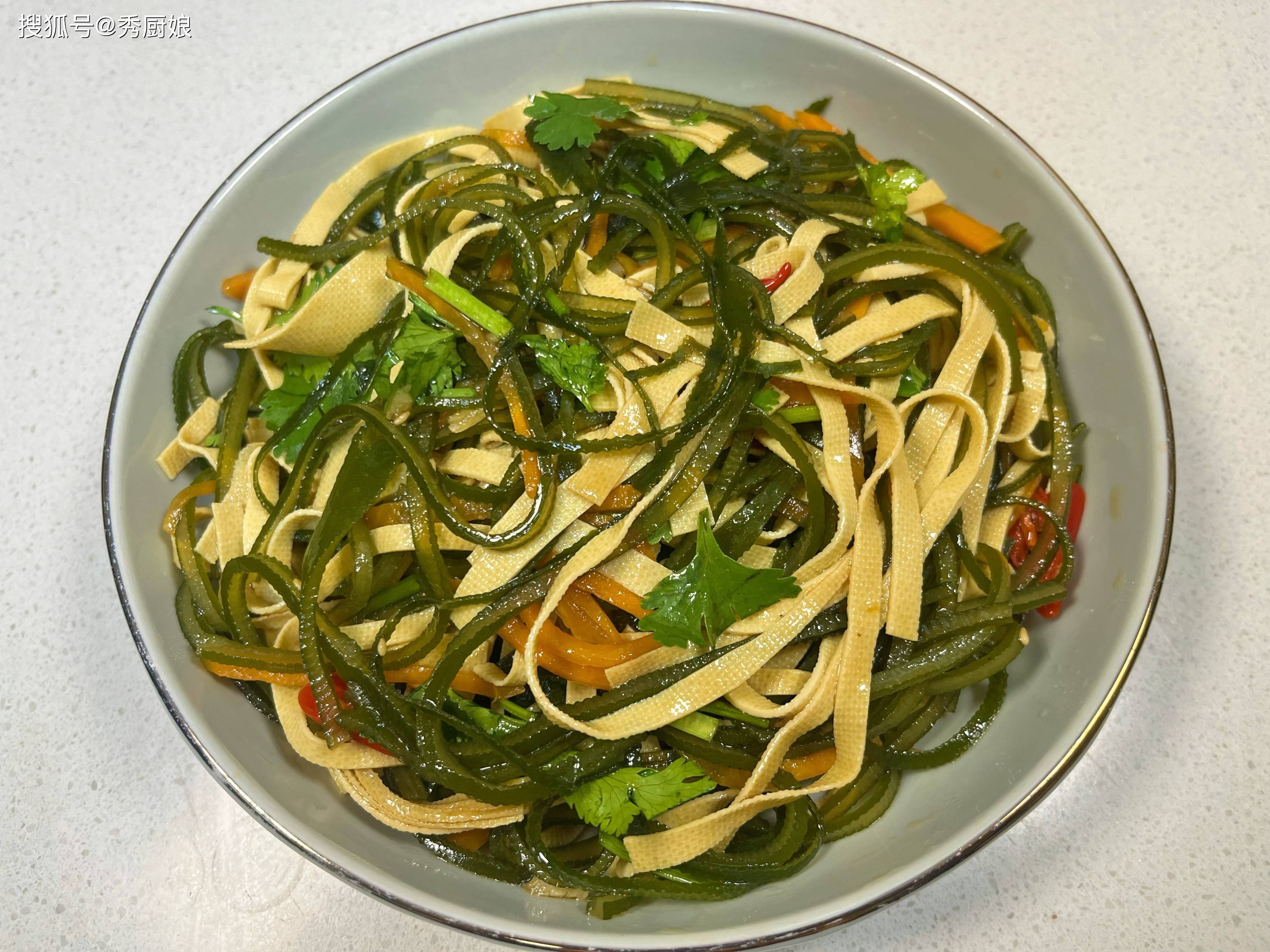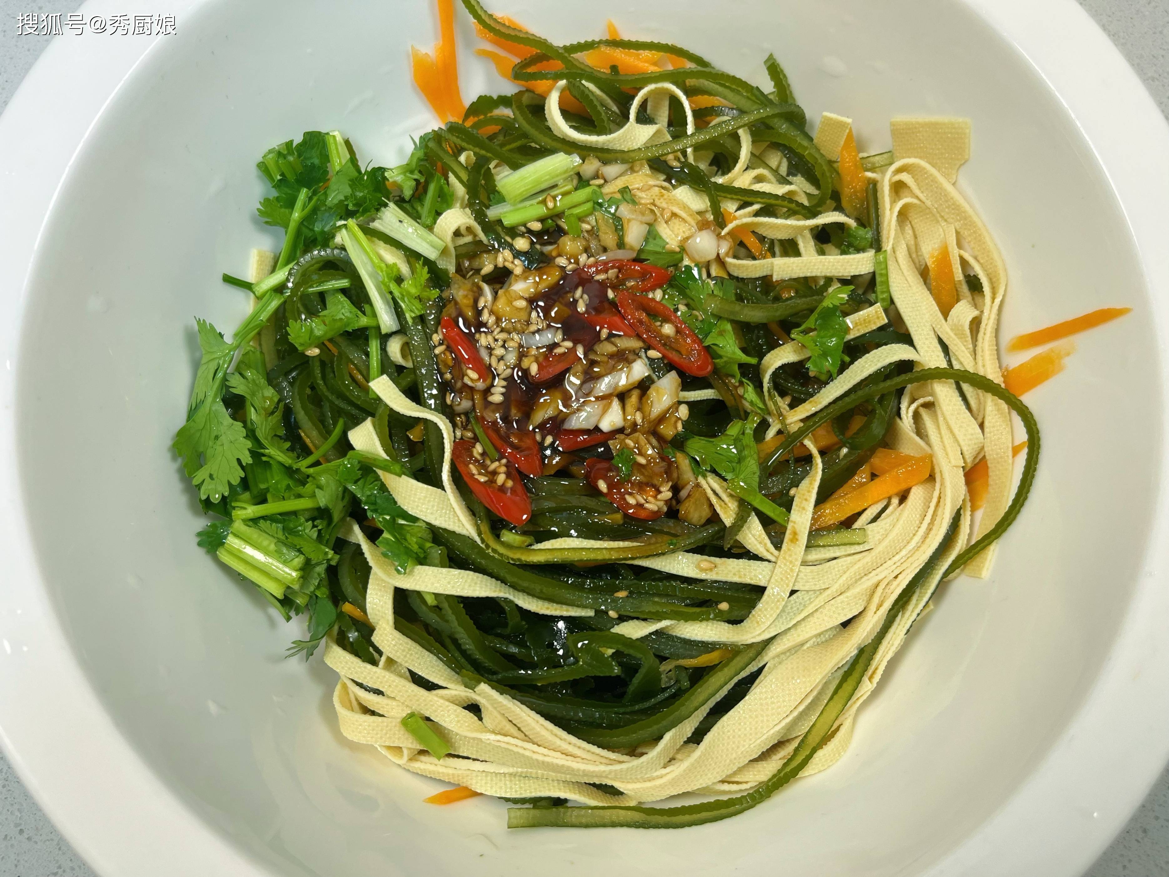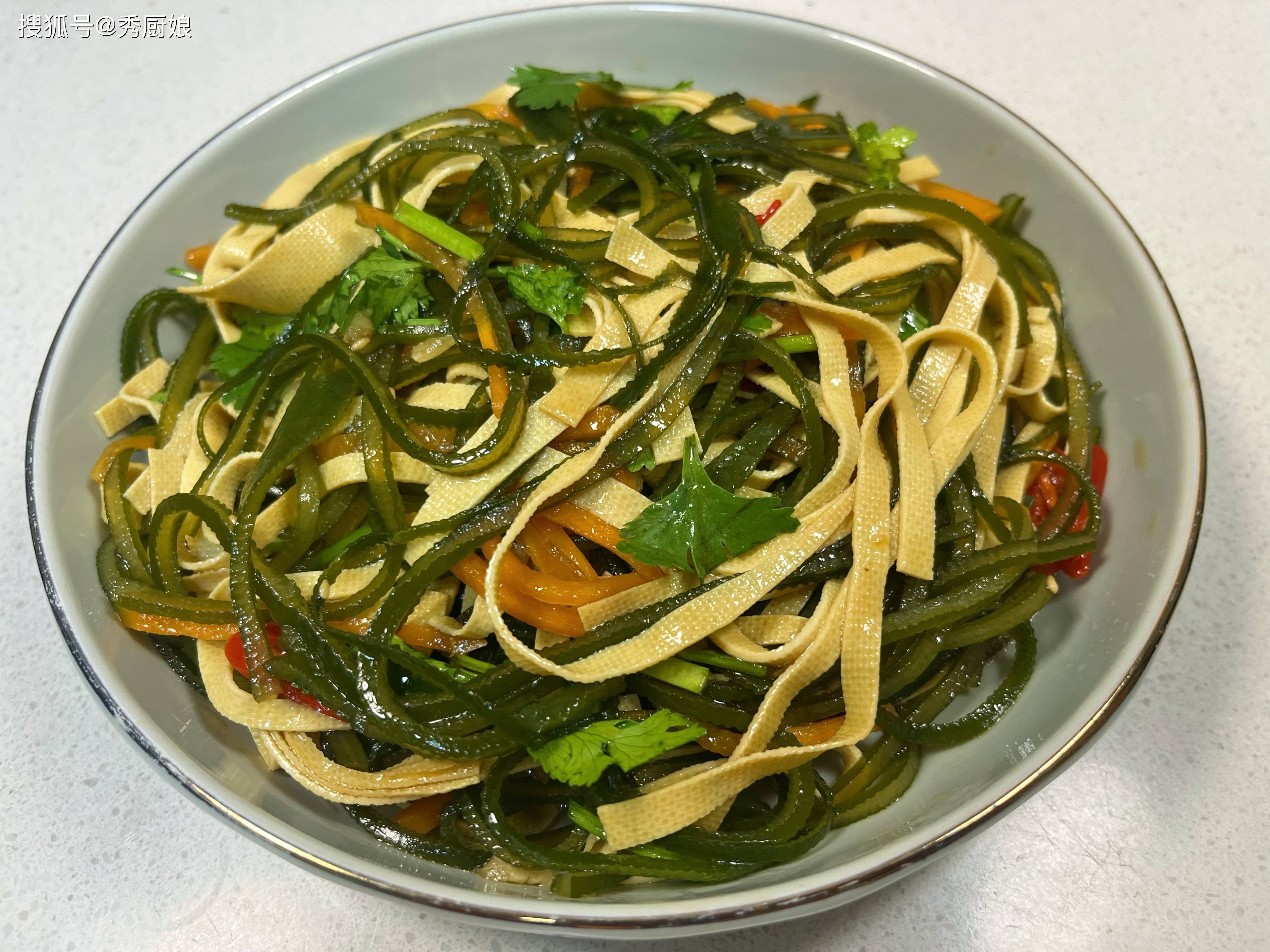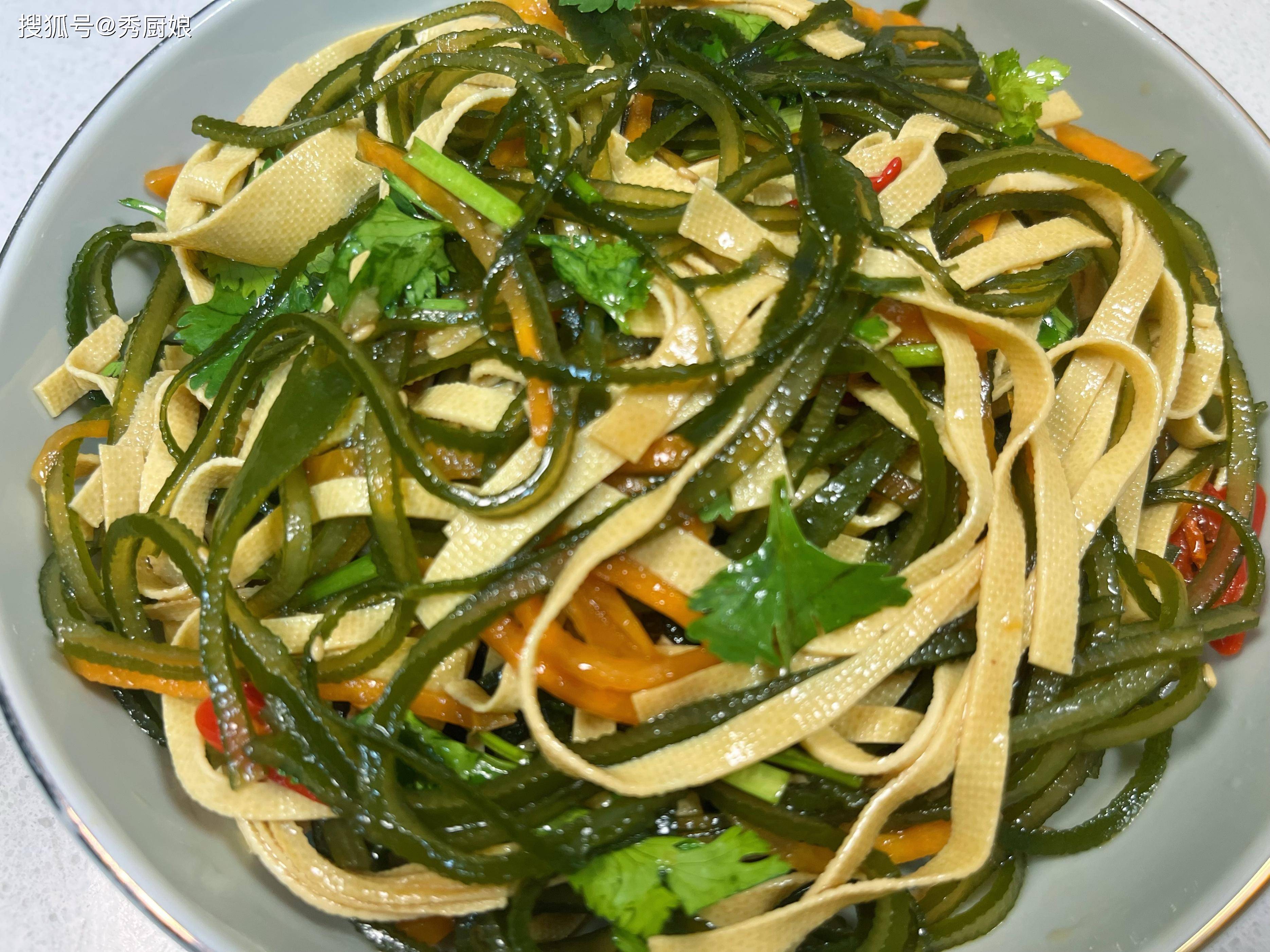 • 开拌! 用筷子或者洗干净的手(戴手套也行),从下往上、兜着盆底翻拌,让每一根海带丝、豆皮丝、胡萝卜丝都均匀地裹上这亮晶晶、香喷喷的料汁。拌好了,装盘上桌!