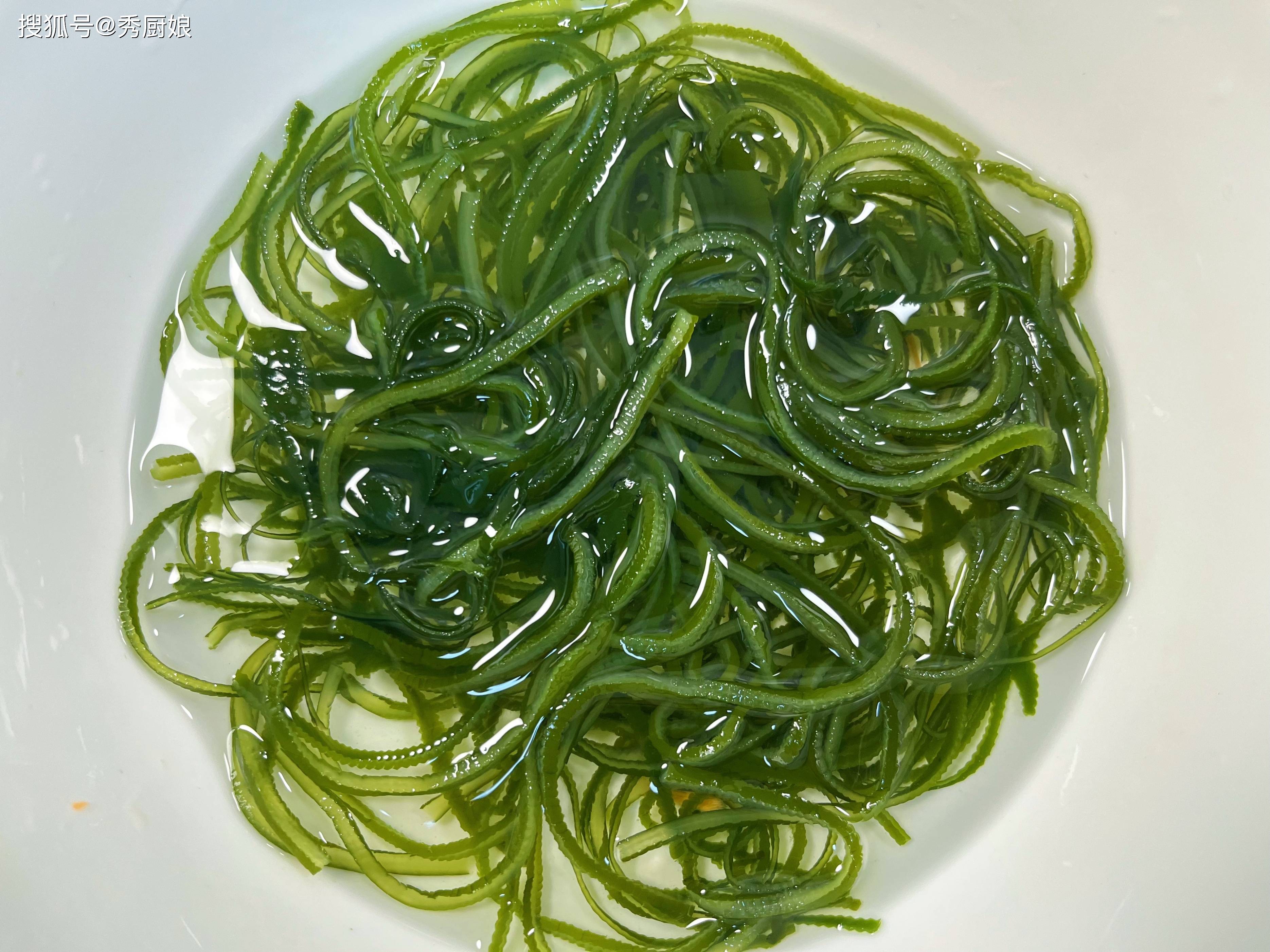 • 干海带丝用足量的凉水泡发。泡个20分钟左右,它就舒展开了,变软变长。重点来了: 泡软的海带丝,一定要用手多搓洗几遍!把它自带的那些细沙粒和附着的一些海腥味搓掉,洗到水变清亮才行。然后捞出来沥沥水。