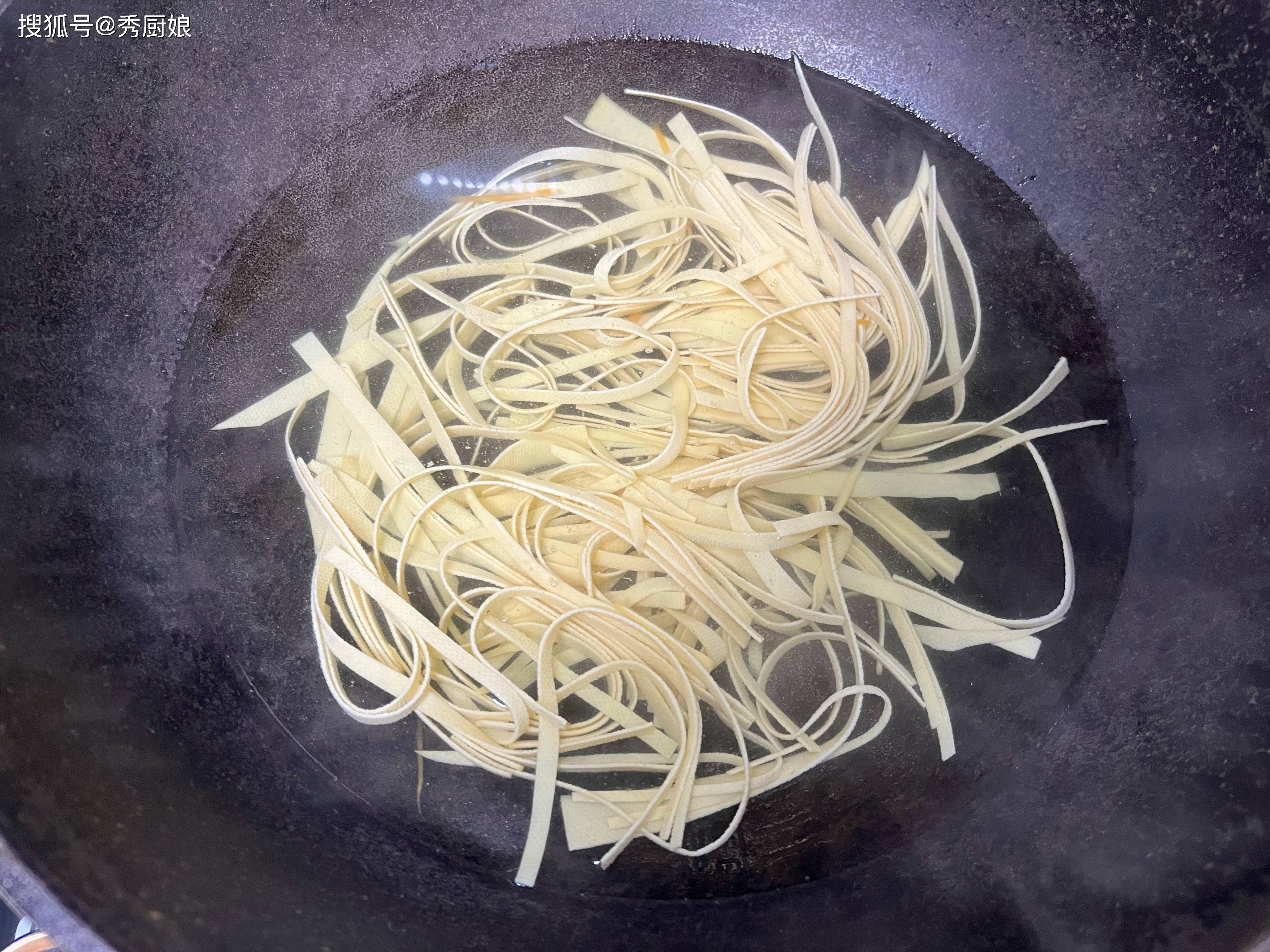 • 烫豆皮丝: 锅里水继续保持沸腾,把攥干水分的豆皮丝倒进去。豆皮丝本来就是熟的,只需要在开水里打个滚儿,烫个30秒左右,看到它完全变软、颜色更鲜亮了,就赶紧捞出来沥干。千万别煮久了! 煮久了软塌塌的没口感。