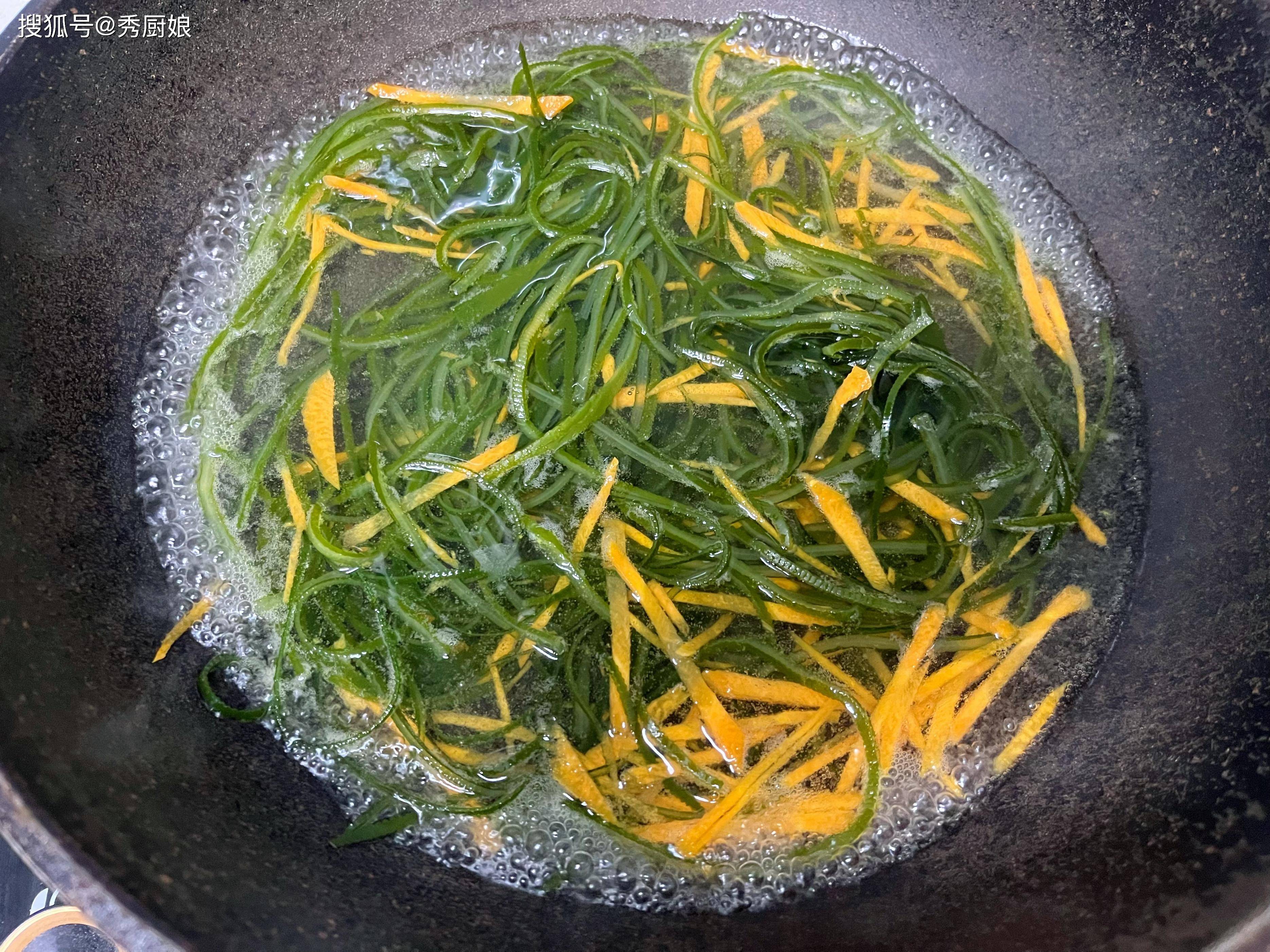 • 焯胡萝卜丝: 最后,把胡萝卜丝倒进滚水里。胡萝卜丝焯水是为了去掉一点生味,让它更甜更脆。时间要更短,大概10-15秒,看到胡萝卜丝颜色变得更鲜艳、稍微变软一点就立刻捞出来沥干。