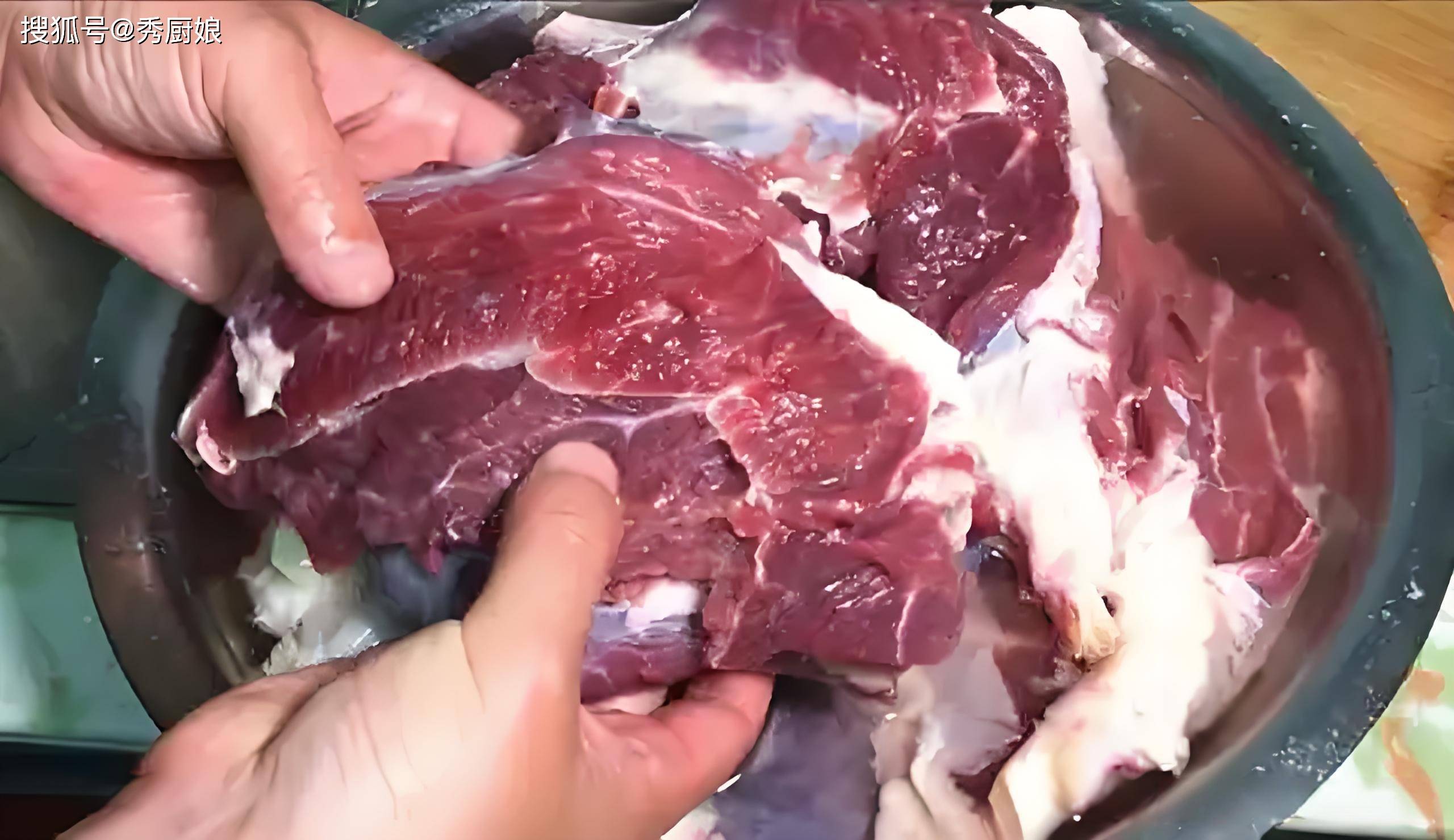 1、 新鲜牛腩或牛腱子肉切大块后, 找一个大盆,注入足量冷水,把牛肉块完全浸没。这一步极其重要!冷水能慢慢诱导出肉块内部残留的血水。浸泡至少 1小时,中途勤快些,换水2-3次。泡到水色清亮,牛肉看着有点发白,血水就去得差不多了。