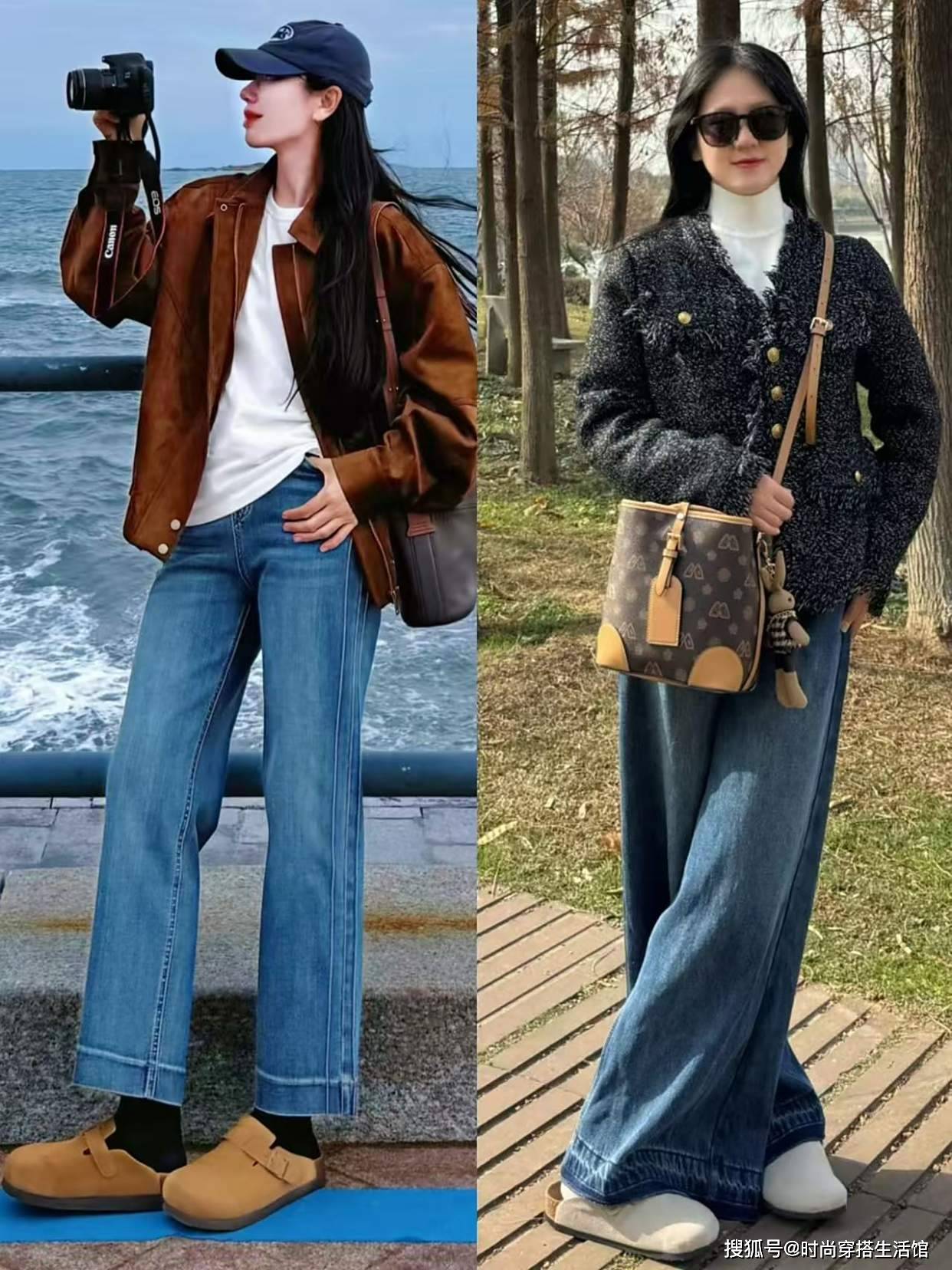 第一章:秋天这样穿阔腿裤+勃肯鞋,时髦慵懒又高级look1.牛仔阔腿裤+勃肯鞋