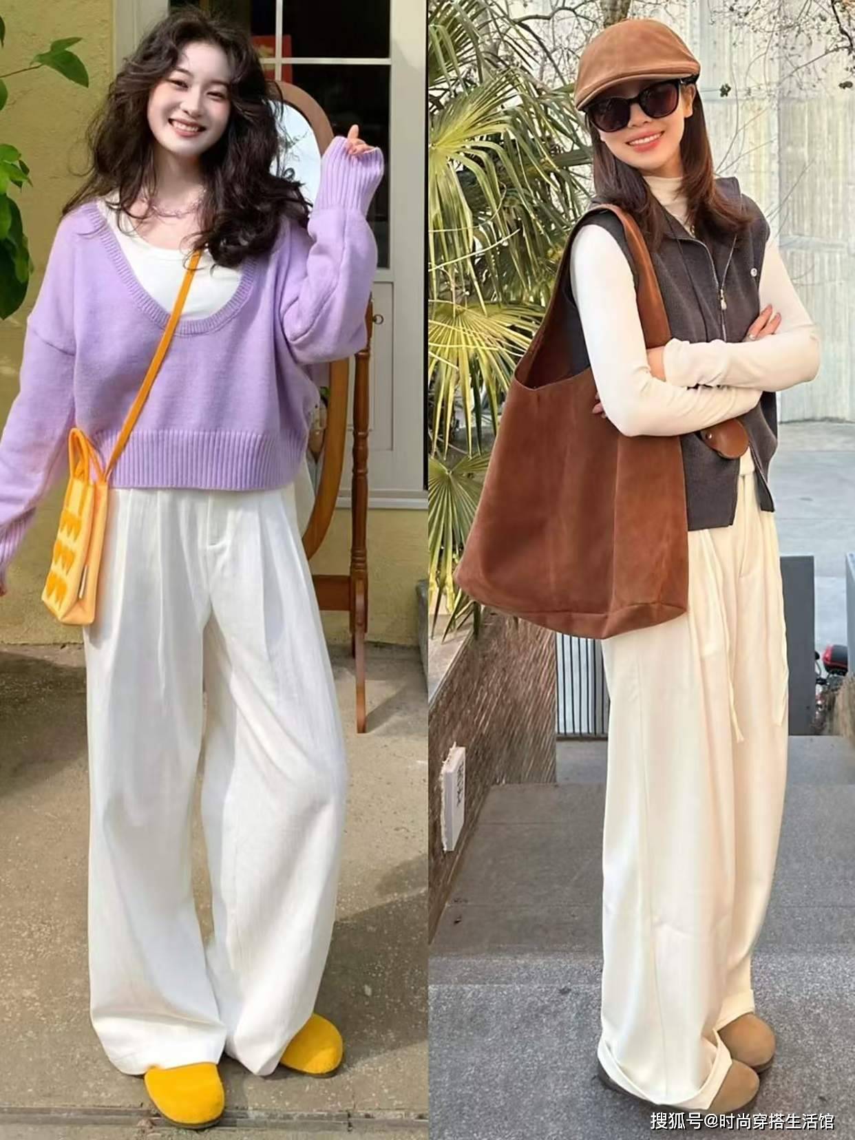 其次秋天我们除了选择牛仔阔腿裤之外,我们还可以选择搭配西装阔腿裤,尤其是西装的材质非常的有垂感和舒适,但对于秋冬季节来说我们要避免选择聚酯纤维含量高的材质,这种面料穿在非常容易褶皱和变形,最好的搭配方式就是选择羊毛面料的西装裤,这种材质穿在身上挺括有型,能够完美的修饰腿型。像是醋酸面料的西裤比较适合春夏季节穿,但羊毛材质的西装裤秋冬季节穿不但保暖,同时长时间穿也不用担心会褶皱,方便日常打理。