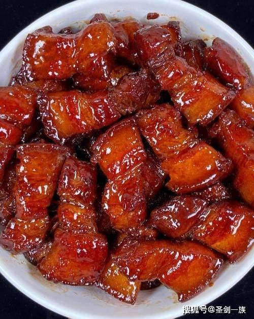 材料:五花肉 500 克、冰糖 20 克、姜片、葱段、八角 2 颗、桂皮 1 小块、香叶 2 片、老抽、生抽、料酒适量。