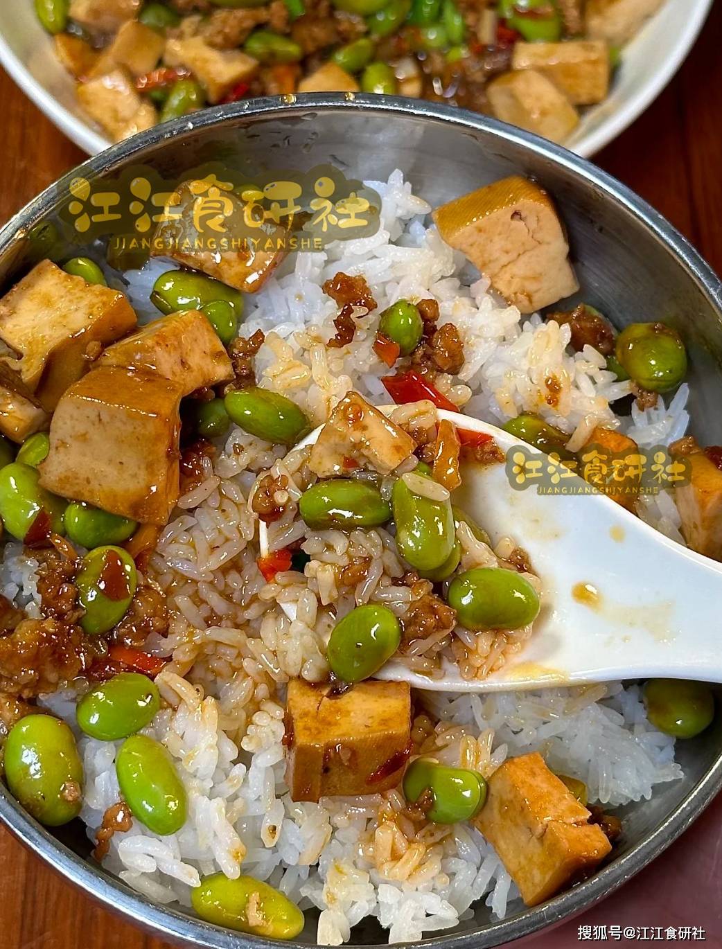 肉末干香,香干韧韧的很有嚼头,毛豆清甜粉糯。一勺舀起盖在热米饭上,拌匀了吃,哎呀,香迷糊了,幸福感爆棚!