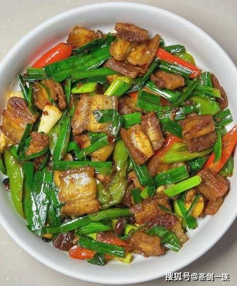 食材:五花肉250克、青椒1个、红椒1个、蒜苗2根、姜片、蒜末适量。