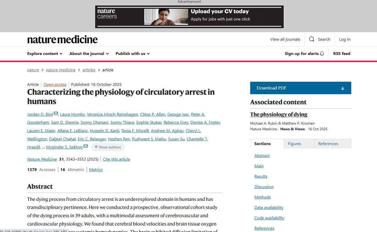 然而在10月16日,《自然医学》杂志上发布的论文却表示,人类的死亡并非是一瞬间的事情,而是一个复杂又漫长的过程。