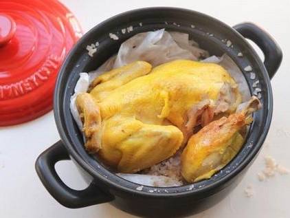- 盐焗鸡肉:将包裹好的鸡放入砂锅,再将剩余部分的海盐填满砂锅,盖住鸡,盖好盖子,小火焗 25 分钟左右,关火后继续焖 20 分钟左右。