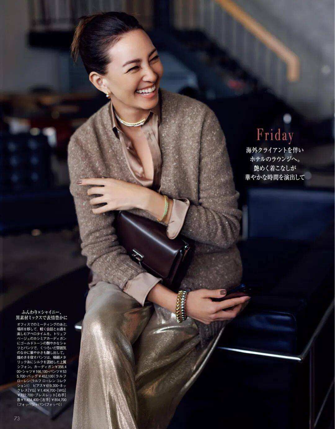 V形开口自然地露出内搭的一角——衬衫的领尖、袖口的折边,讲究的项链,这些细节让整体更生动。