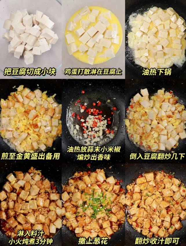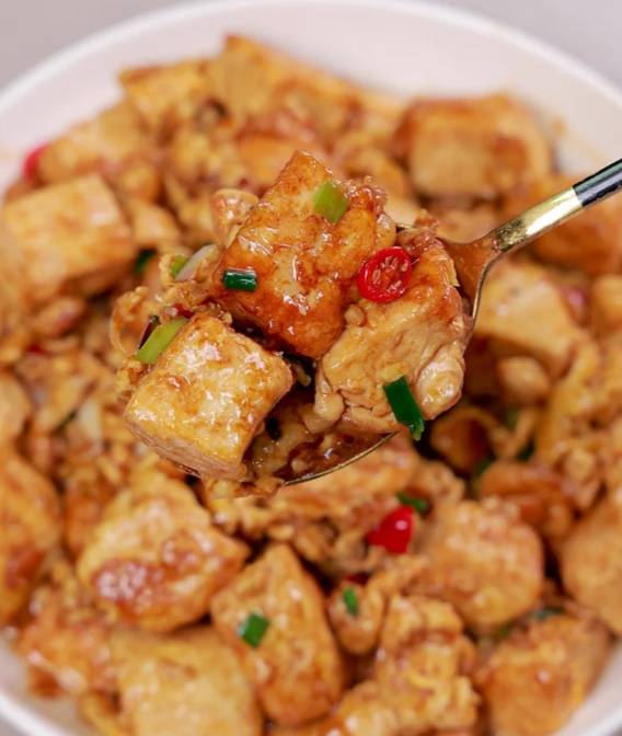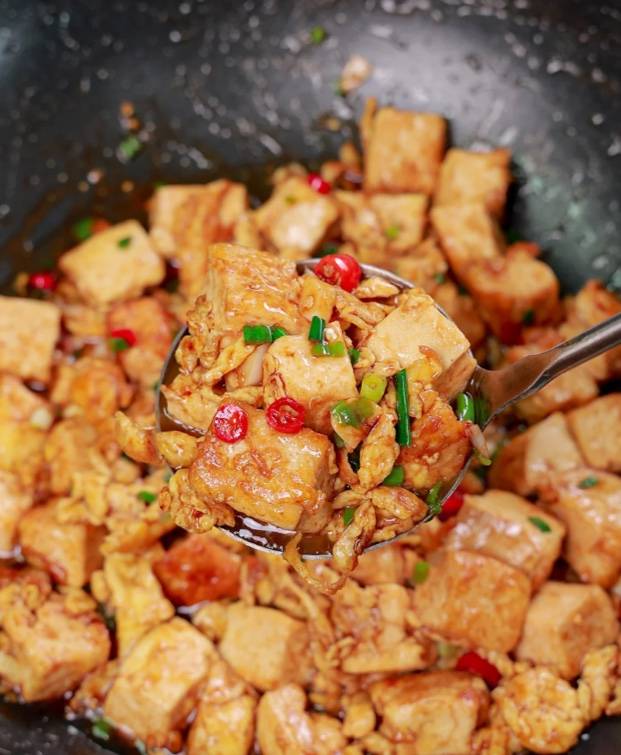 关火前尝尝味道,根据咸淡补点盐。如果喜欢更鲜一点,可以撒点葱花或香菜末提香,红黄绿相间,颜值立马提升!装盘后趁热开吃才最过瘾——豆腐外微韧、内滑嫩,咬下去豆香四溢;鸡蛋蓬松软嫩,裹着咸鲜酱汁,两者在口中交融,口感层次丰富却不油腻。配上一碗刚蒸好的大米饭,那叫一个绝!米饭吸饱了蛋香和豆腐汁,粒粒分明又入味,不知不觉就干掉两碗!
