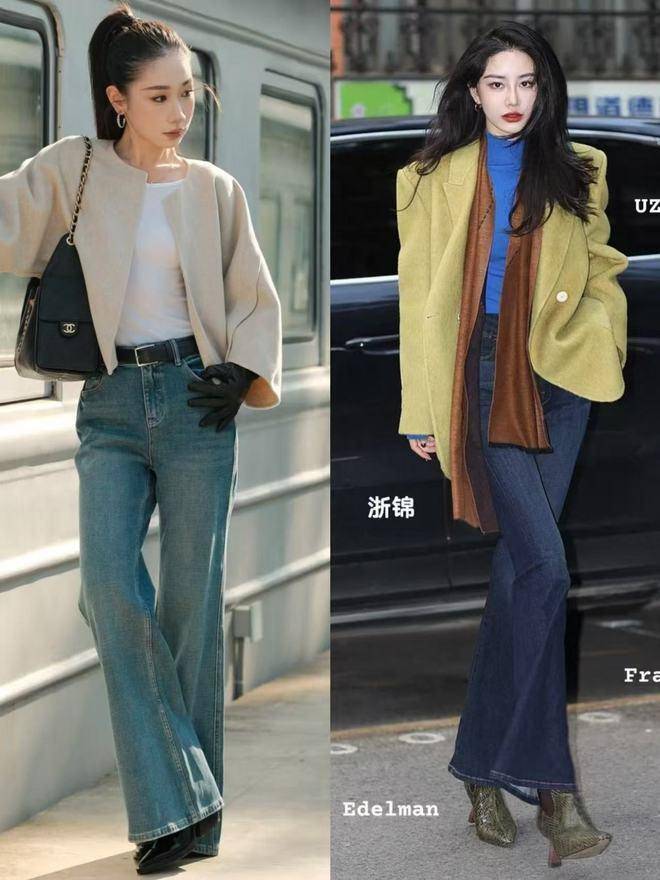 个子高挑的女性想要穿出御姐的气质范,这时候我们可以选择一条牛仔阔腿微喇叭裤,这种裤子穿在身上之后能让你的腿部线条变得非常的流畅,让你拥有大长腿,再加上一件短外套,脚穿一双高跟短靴,秒变成气质女神。