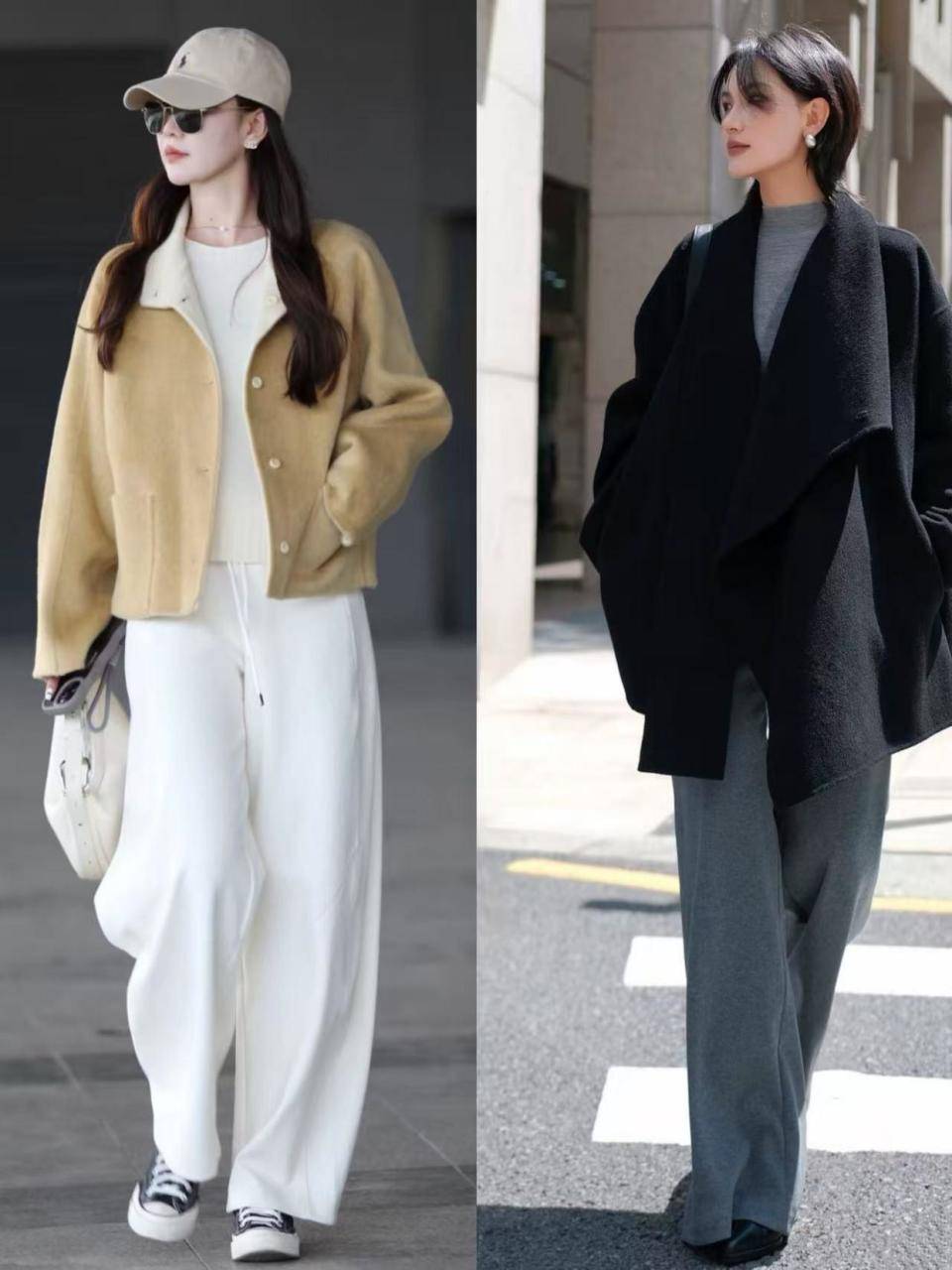 当你选择阔腿裤来搭配大衣外套的时候,裤脚尽量不要太长,到脚踝的位置就可以了,因为过长的话显得拖沓邋遢,上面这条白色阔腿裤和灰色阔腿裤长度正好合适,搭配驼色的短外套,加上卡其色的棒球帽,使得穿搭者年轻十岁都不止。