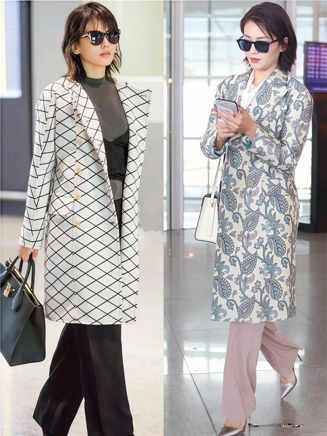 像刘涛这样的高挑身材,也没敢用紧身裤来和带外套组合,而是选择了一条直筒的西装裤,面料挺括有型,穿在身上就可以遮住腿部缺点。 同时,又有垂坠感,看上去却不会显得那么的呆板,用黑色和浅粉色的西装搭配印花大衣外套,走起路来自带风,又飒又美。