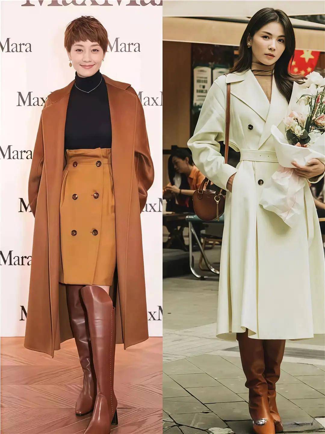 长筒靴确实是冬季女性们最喜爱的单品,穿在脚上就能延伸腿部线条,还能提升造型的气质和档次。例如上面这2套穿搭用的都是大衣外套,搭配上裙子,脚上穿的驼色的中筒靴,散发出来的气质有一种轻熟风的御姐范。