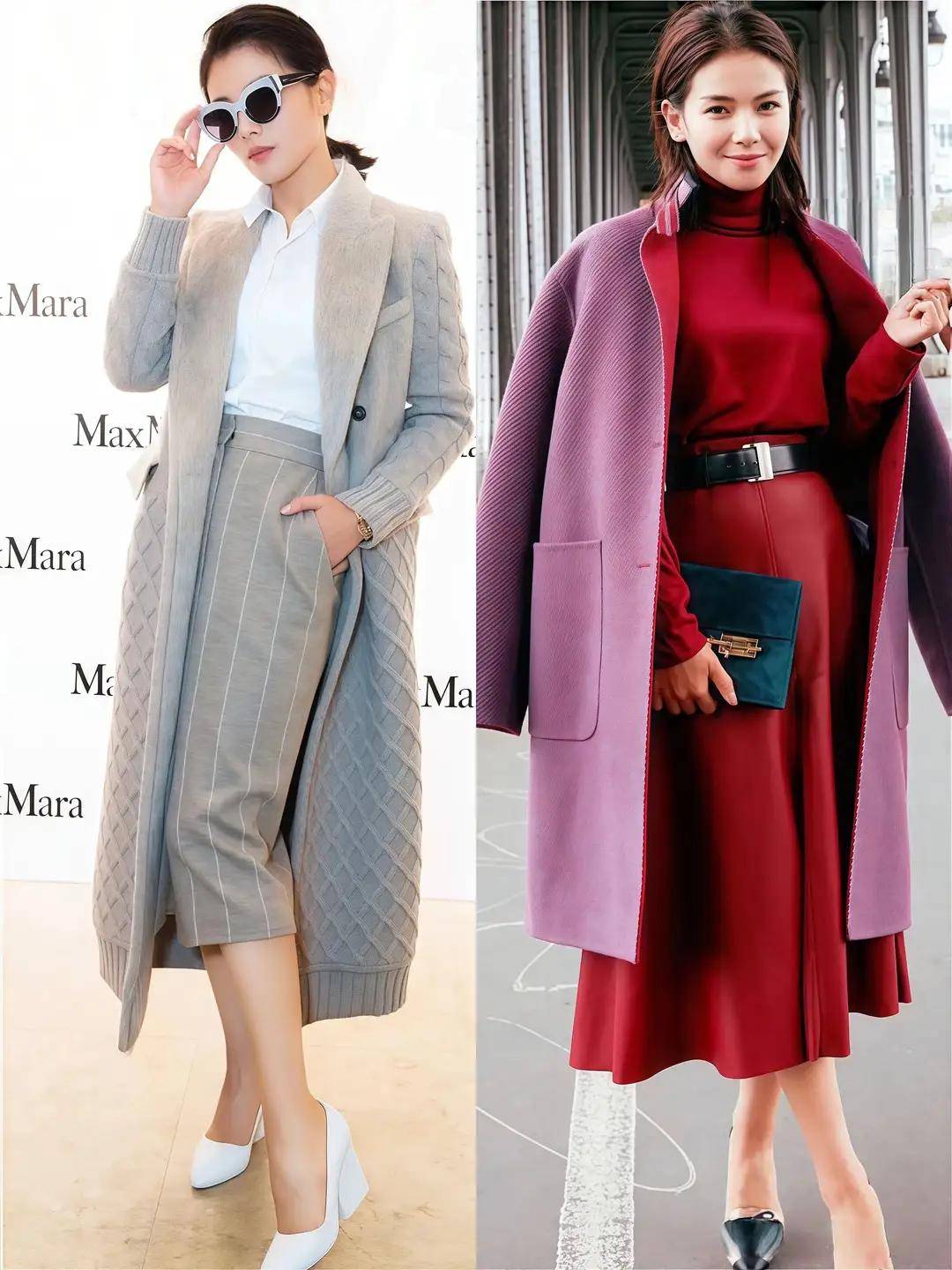 连女明星这么高的颜值和好身材,同样也会采用极简的穿搭风格,例如刘涛用的也是一件灰色和浅灰色的大衣外套,搭配上半身裙,这样的基础色搭配能够降低配色的出错率,更容易穿出高级感。