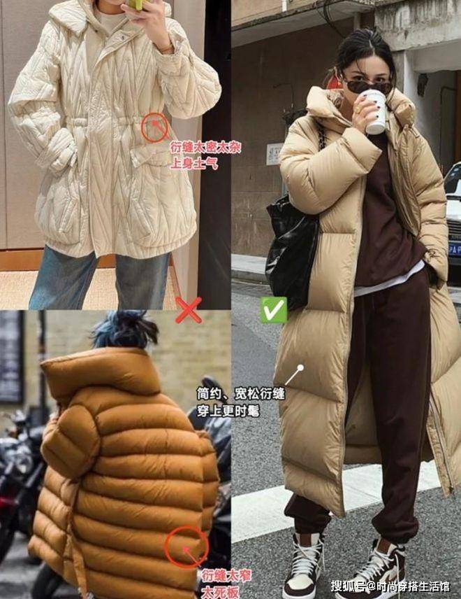 冬天穿羽绒服我们首先要注重的就是要注重衍缝线的选择,毕竟羽绒服最重要的特征就是横条纹、菱形、格子等规则几何图形,如果我们选择的羽绒服衍缝线太过于密集、窄小和冗杂的话,就很容易出现呆板和土气的现象,那么最好的方式就是可以选择简约和宽松的衍缝线,搭配上干练利落的下装和靴子,能够有效的削弱羽绒服带来的膨胀感。