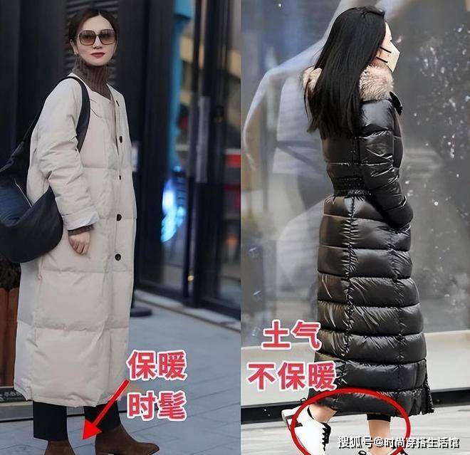 反之我们要避免选择像上图过短和过长的羽绒服,过短的话很容易暴露身材缺点,过长的话又会出现寒酸和邋遢的现象,那么这时候的我们就需要搭配合适的靴子来弥补身高的不足,从而来缩短视觉比例。