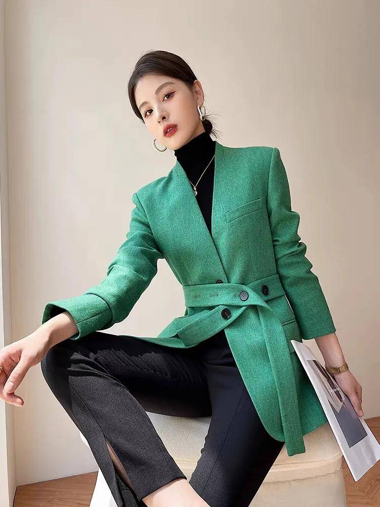 01 翠绿色+灰色 (适合冷色调的肤色类型) 翠绿色属于正绿色,清新,富有生机,搭配低调、内敛的灰色,完美地中和了翠绿色的鲜艳感,使整体搭配显得更加和谐与高级。 无论是选择一件翠绿色的大衣搭配灰色的内搭,在灰色系的穿搭里,搭配一件翠绿色的内搭,在视觉上形成鲜明对比,瞬间提升整个穿搭的时尚度和吸引力。
