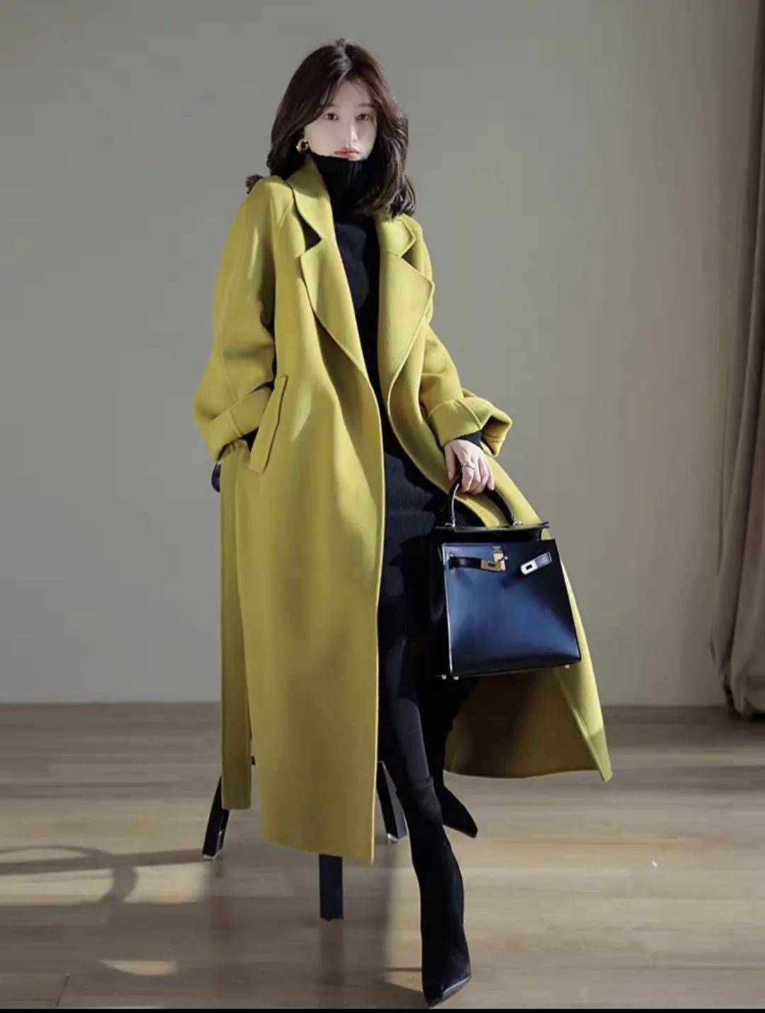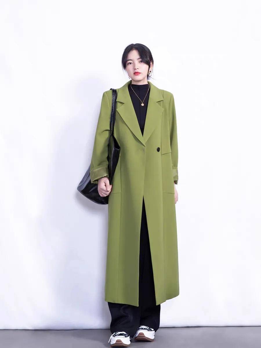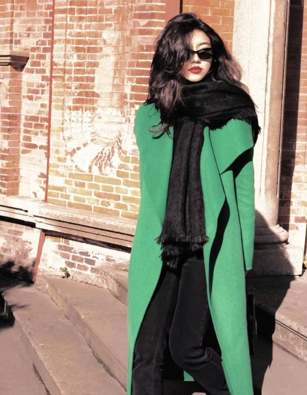 05 黄绿色+黑色 (适合白皙的暖色调肤色类型) 黄绿色属于偏暖调的绿色,色值比较靠近黄色,所以更适合暖色调肤色的人穿搭。 当黄绿色与黑色进行搭配时,给人一种温暖而明亮又有质感的感觉。 选择一件黄绿色大衣内搭一整套黑色的单品,很好地平衡黄绿色的黄色调,让肤色更显均匀和白皙。这组配色会显得很独特,如果你是暖色调的肤色,可以大胆尝试一下。