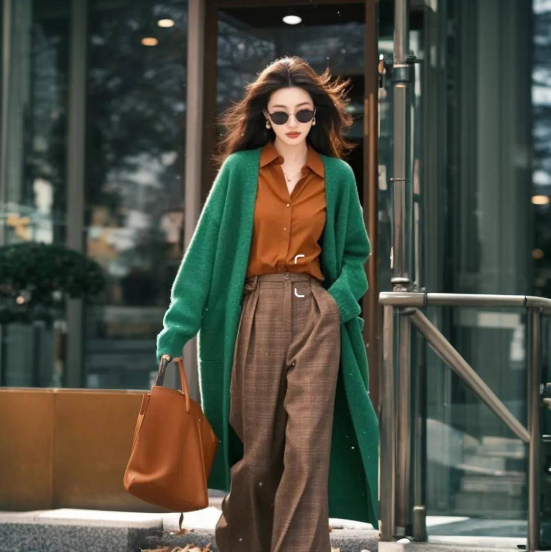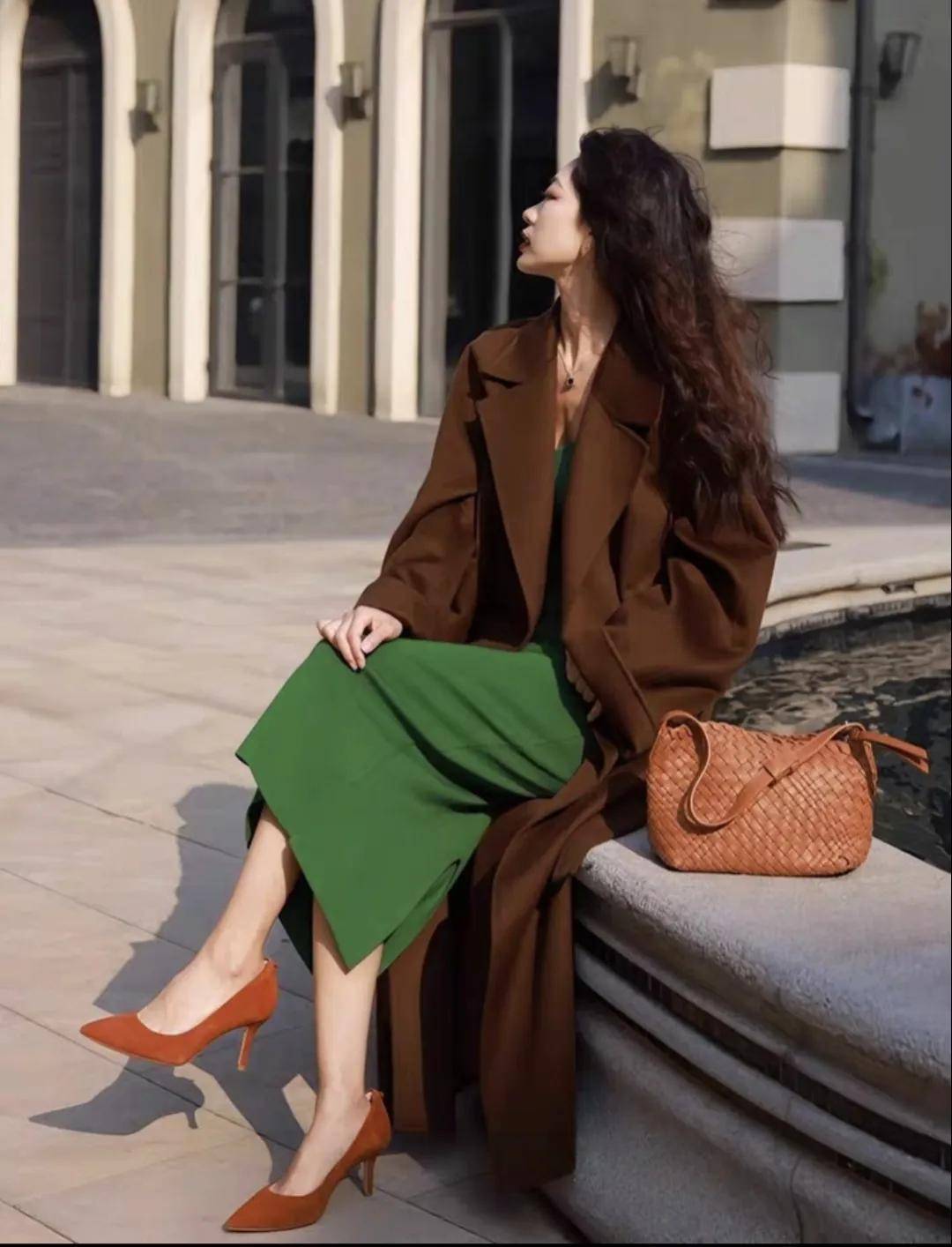 04 墨绿色+棕色 (适合白皙的暖色调的肤色类型) 这是一组复古色搭配,非常显温暖又高级的视觉效果。 浓郁的自然气息的墨绿色,就像冬日里常青树的颜色,搭配沉稳且厚重的棕色,为整体造型增添一份踏实和可靠。 这样的配色方案既不会过于张扬,又能恰到好处地表达个性,非常适合追求低调优雅风格的人士在冬天尝试。