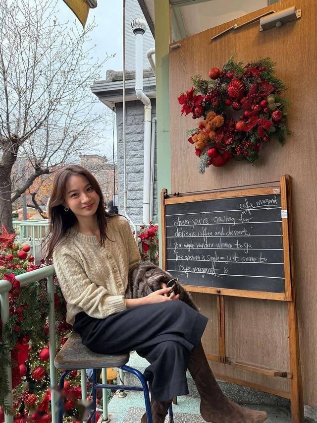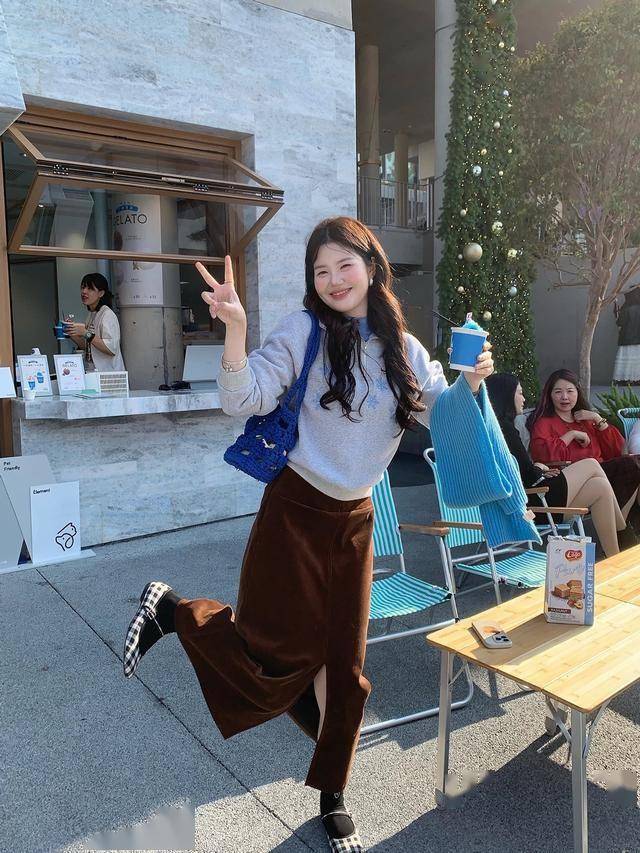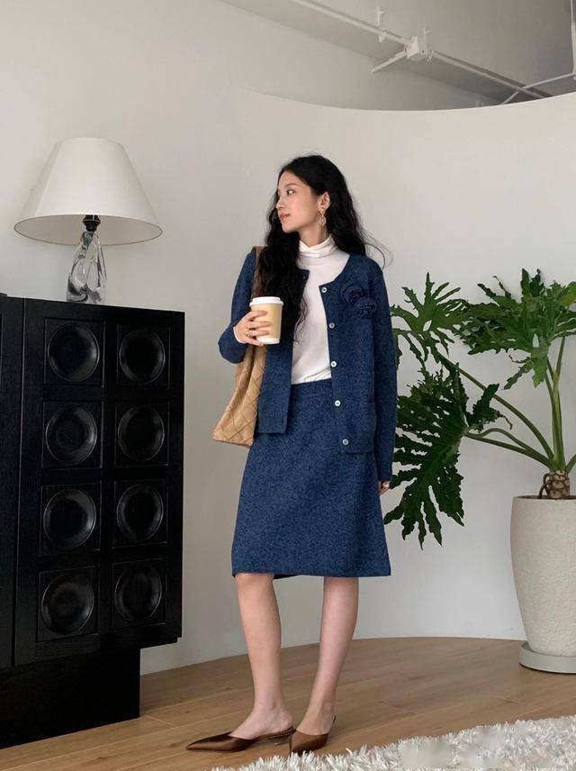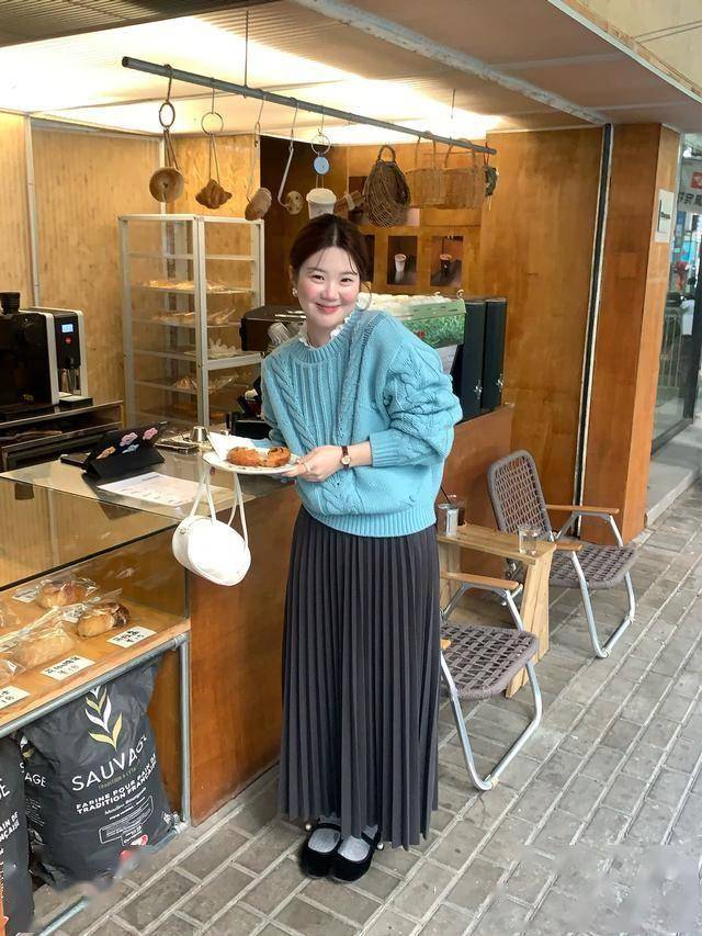 湖蓝色的粗针织毛衣,下摆、袖口螺纹收紧,显瘦效果一流,配条窄褶长裙,精致度拉满。
