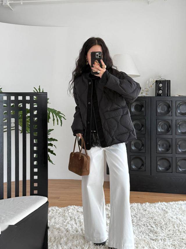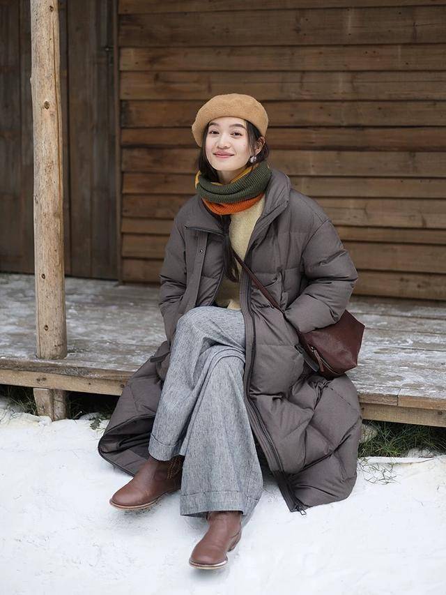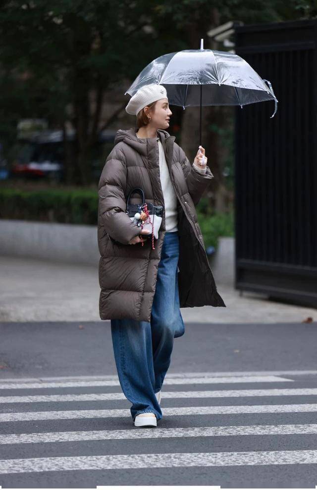 宽松版型的长羽绒服,敞开穿更好看,内搭毛衣和阔腿裤,鞋子精致轻便一点,更平衡。