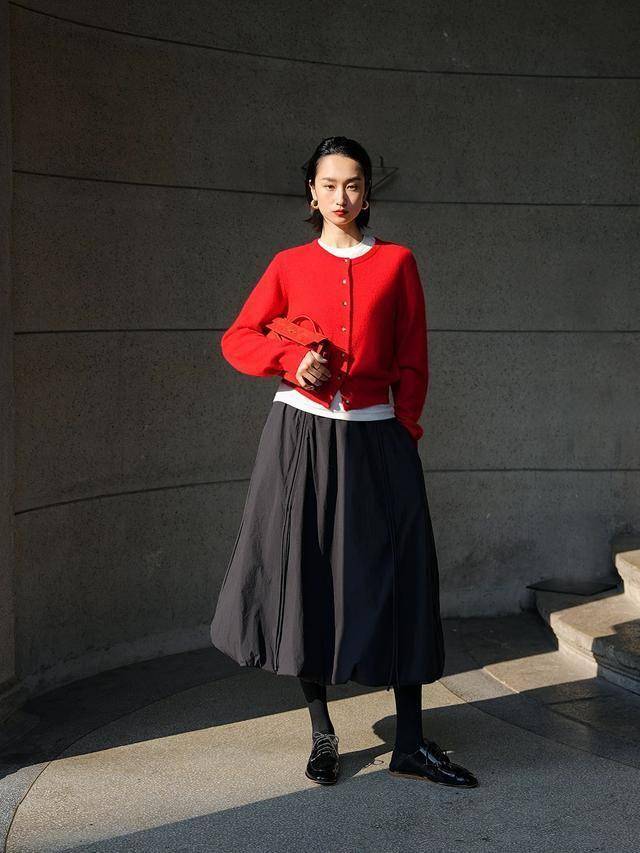 红色针织衫里面叠穿白T恤,配条黑色花苞裙,彩色+基础色的配色公式,削弱了浮夸感。